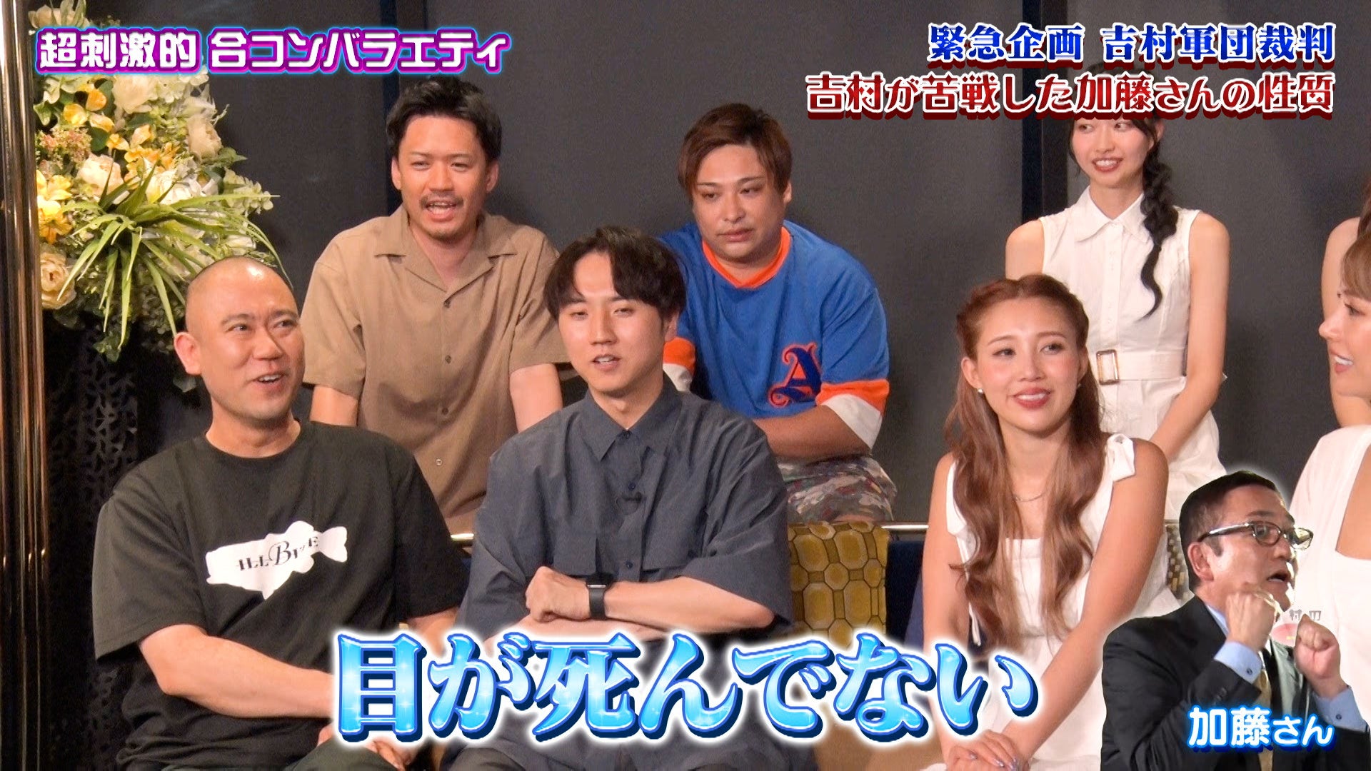 じつは、吉村軍団のメンバーで、番組スポンサー「にしたんクリニック」西村社長の指名で出演が決まった一般人・加藤正樹さんが、今回の合コン中に大暴走。番組お蔵入りの危機に直面しました。合コン終了後、吉村からスタッフに、問題点をすべてさらけだした上で見た方が面白いのではないか、との提案があり、今回の裁判が実現しました。