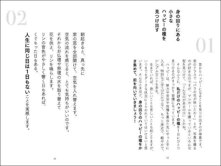 ハッピーの種を見つけ出す/窓を開けて、空気を入れ替え/早起きして運動する/朝40分のストレッチ/怠けたくなる日もあるけれど/朝の食事を慈しむ!/同じ卵でも、同じメニューにしない/好きなものを使い続ける/座りっぱなしに要注意!/ハッピーな私のために/何でもすぐにメモ、メモ、メモ!/バカンスの過ごし方/日々の暮らしからの発想…ほか