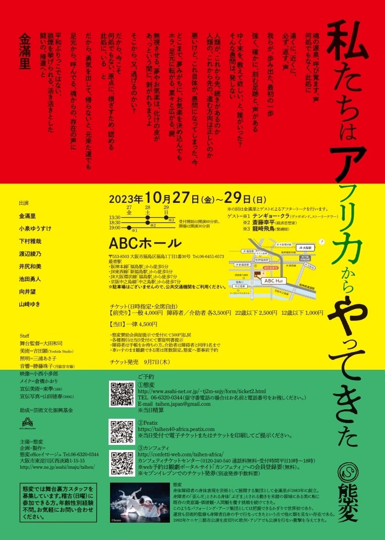 そして今年、40周年を迎える態変が真正面からアフリカに挑みます。 今、毎日のニュースから、戦争の話題が消えることがありません。 覇権と欲得にまみれて人類全体を破滅に導きかねない政治のパワーゲームに最も翻弄されているのがアフリカ諸国かもしれません。しかしアフリカは、人間の持つ本質的な力という面で、強大な力を秘めているようです。 そういう力を我々自身が呼び覚ましていくことが、破滅に太刀打ちしていく術なのではないか。 態変が「戦争」を描く時、そこにこそ希望があるのではないかと思うのです。