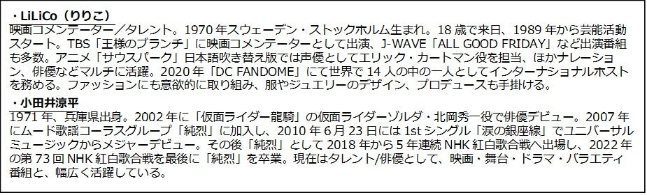 LiLiCo氏は、言わずと知れた日本を代表する映画コメンテーター/タレントで、これまで多くの海外スターとの単独インタビューを行われている他、多数のTV番組やラジオ、アニメの声優やナレーションなどマルチに活躍しています。