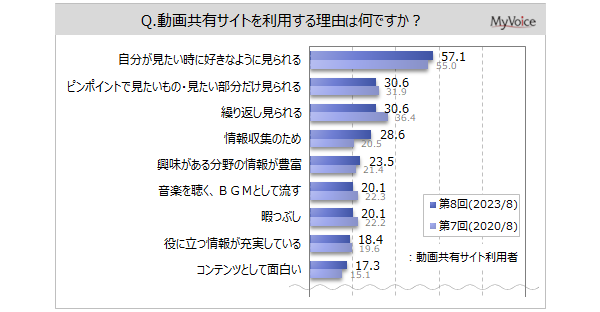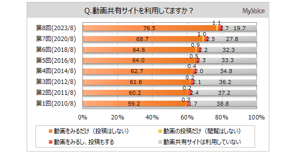 <今 回>(2023/8)https://myel.myvoice.jp/products/detail.php?product_id=30110 上記設問の他に、「1日あたりの閲覧時間」「動画共有サイトを閲覧する端末」も聞いています。 <第7回>(2020/8)https://myel.myvoice.jp/products/detail.php?product_id=26509 <第6回>(2018/8)https://myel.myvoice.jp/products/detail.php?product_id=24110 |