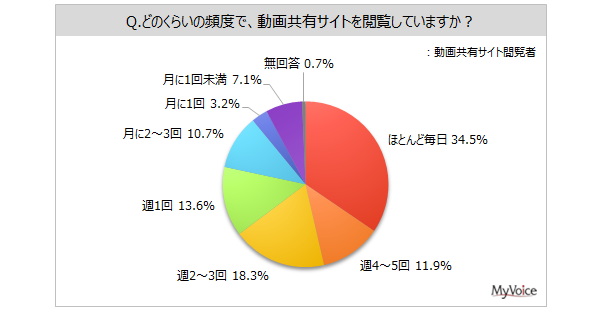 動画共有サイト閲覧者のうち、週1回以上閲覧する人は8割弱です。「ほとんど毎日」は34.5%、男性10・20代で8割弱、男性30代と女性10・20代で各6割となっています。