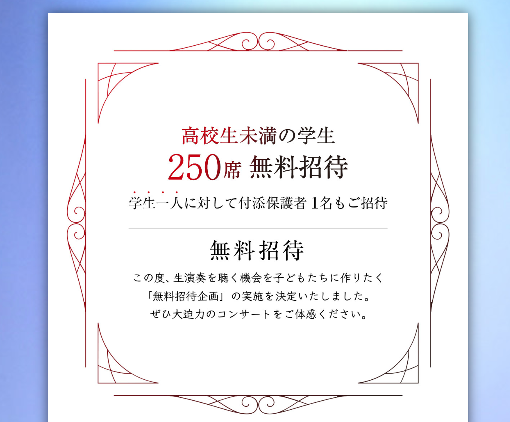 今回関係各社の協力より、地元の子供達へコンサートの大迫力と生演奏の素晴らしさを肌で感じてもらいたく2階席を無料開放決定!