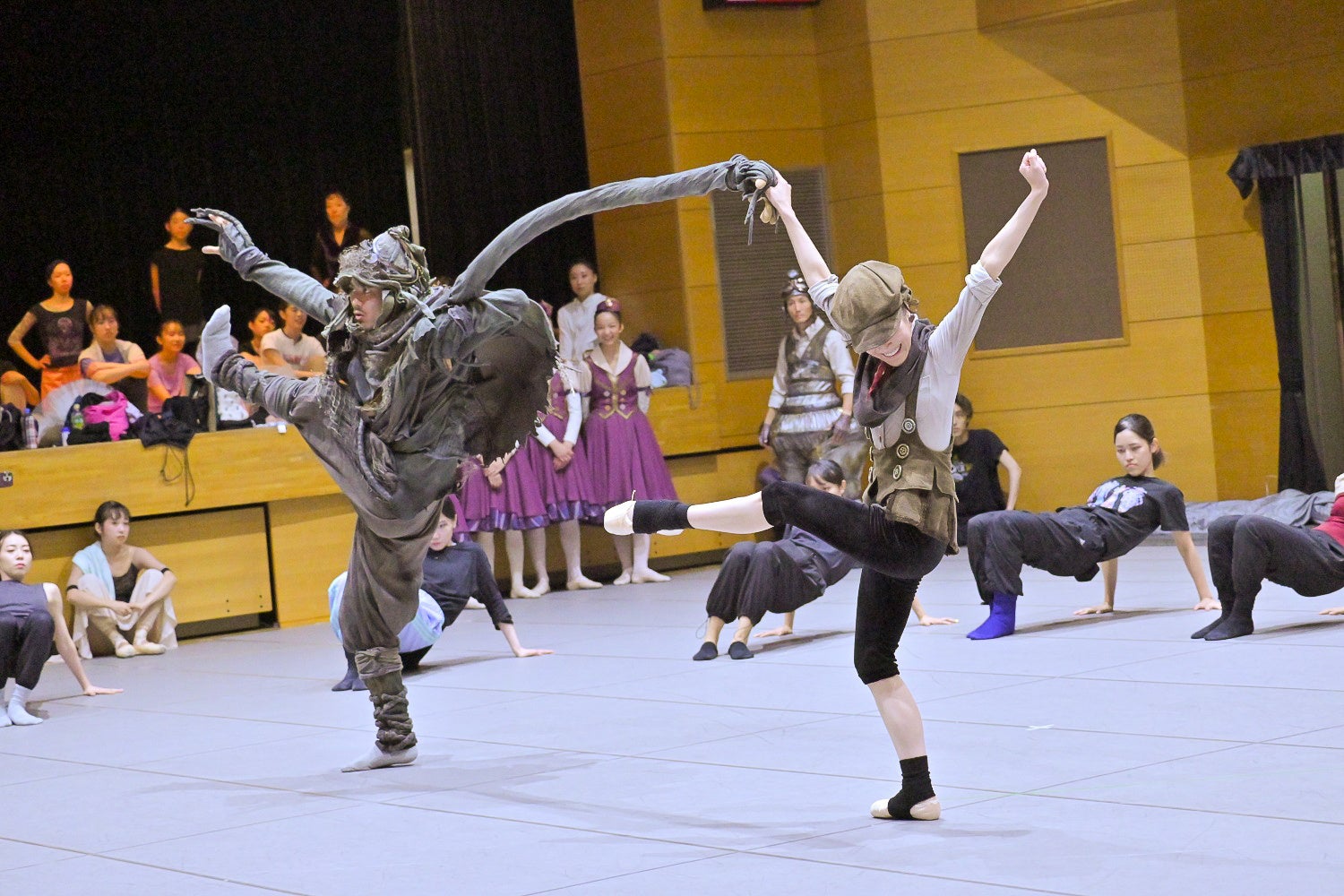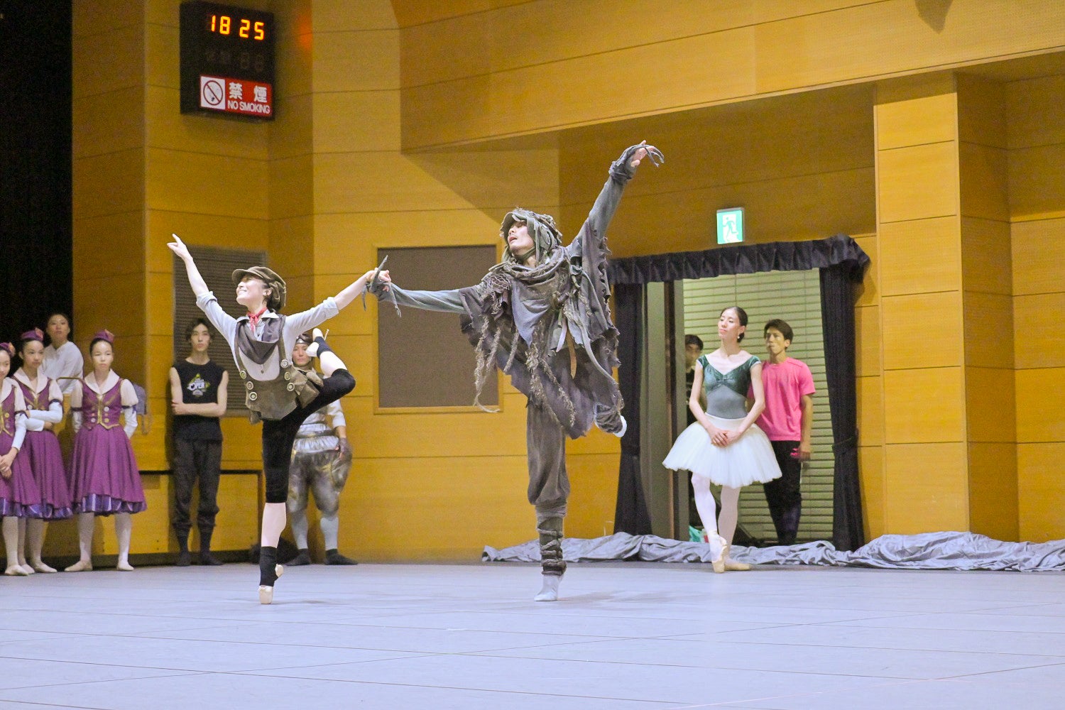 通し稽古ではプペル、ルビッチ、スコップとスコップが引き連れている子どもたちが衣装を着けて登場。小柄な竹田と大柄な風間の対比のバランスがとてもいい雰囲気を醸し、また音符に言葉が見えそうな宝満の振付に演技達者な2人のやり取りが重なり、言葉のないバレエが幾重にも雄弁に語りかけてくるのが印象的だ。八幡の踊りは非常に軽快。白石演じるレベッカの存在感は、宝満に「女帝」と言わしめるほどの圧倒的なオーラを放っており、ルビッチVSレベッカのやり取りは、見どころのひとつとなると思わせられる。煙に見立てた布がプペルを巻き込むシーンはトリッキーな味わいも感じさせるダイナミックさがあり、風間の「凄さ」が発揮されるプペルのソロは圧巻。非常に濃厚な、数々の見どころにあふれた舞台に仕上がることは間違いない。