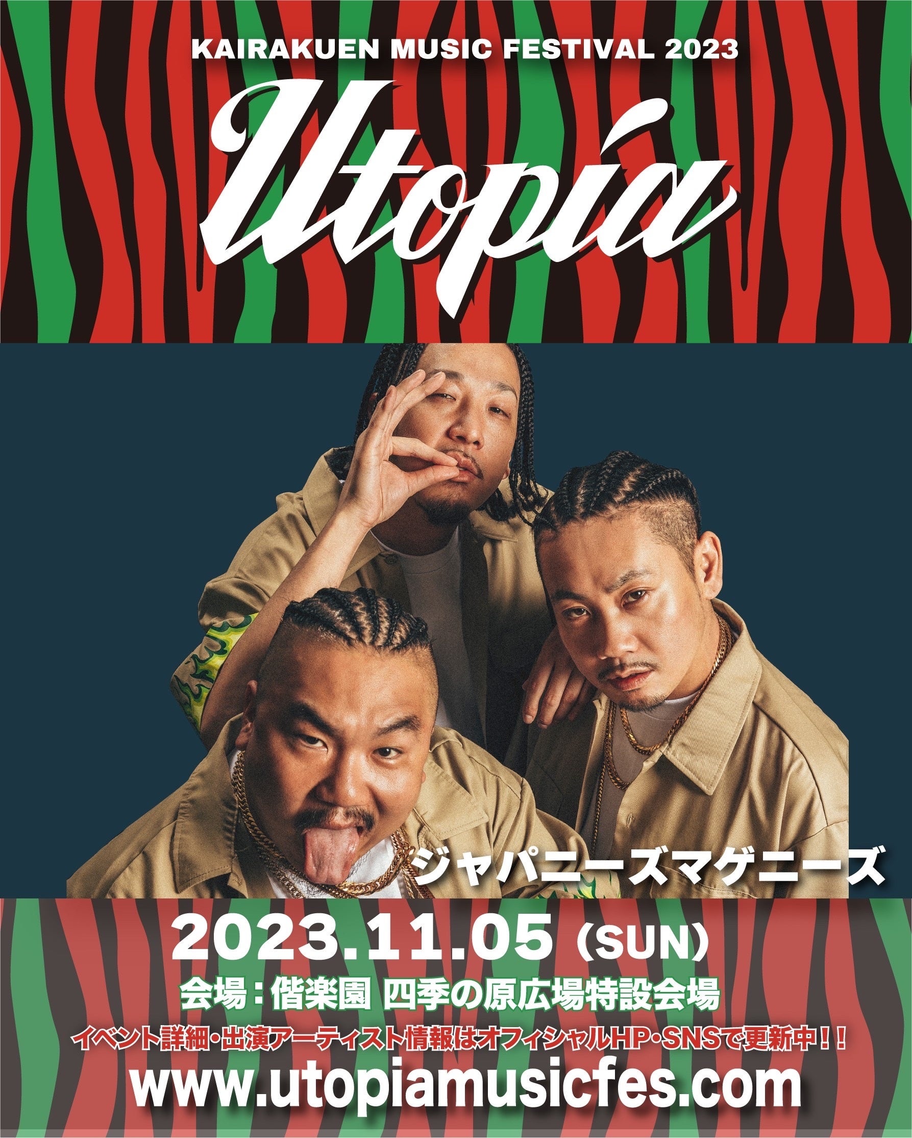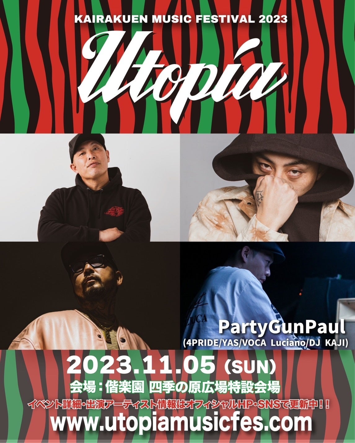 偕楽園音楽祭が新たにUTOPIAと名前を変え、2023年11月5日(日)に、茨城県水戸市の偕楽園四季の原広場特設会場にて音楽フェスを開催致します。国内HIP HOPアーティストが多数出演し、多店舗の飲食ブースが出店するフェスになります。