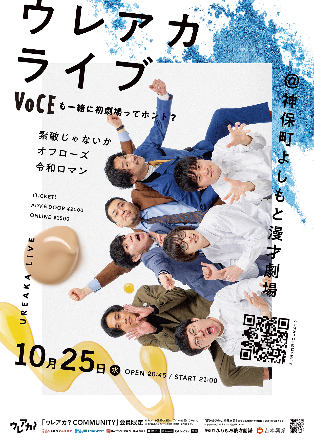 <配信チケット>【料金】1,500円【販売期間】 9月12日(火)11:00~10月27日(金)12:00【見逃し視聴】10月27日(金)21:00まで【URL】https://online-ticket.yoshimoto.co.jp (「ウレアカライブ」で検索)