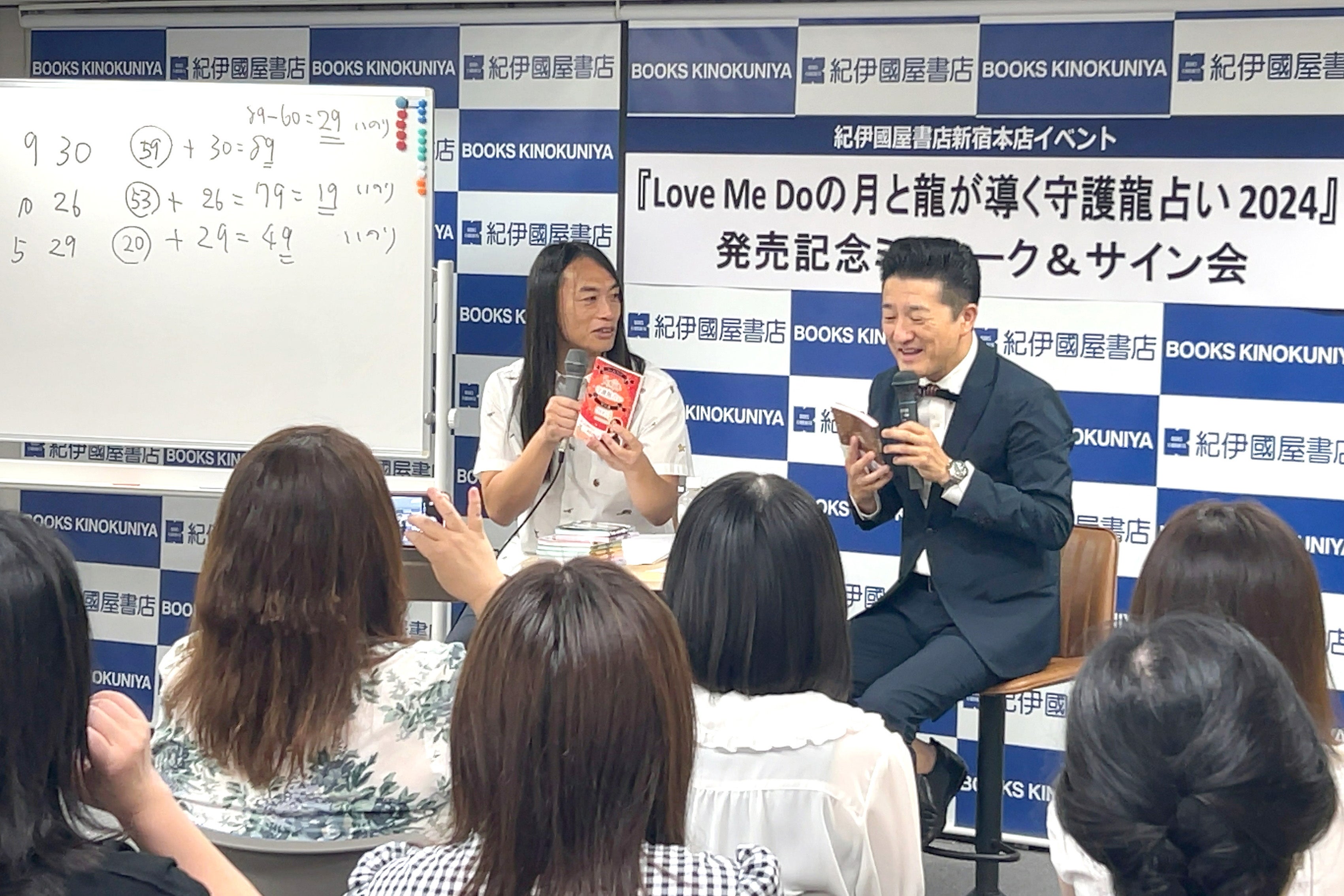 「このイベントの日、とんでもない日なのかもしれないですね。大きな会見があったり明日は大雨だったり……」と始めるLove Me Doさん。トークライブではMCにキクチウソツカナイ。さんを迎えて、龍の神秘的な神話や、2024年に起こる震える予言、サブタイトルに込めた想い、この本を出版するにあたり龍を祀る神社へ行ったこと、今話題の芸能人の守護龍についてなどのトークにファンは熱心に耳を傾けていました。