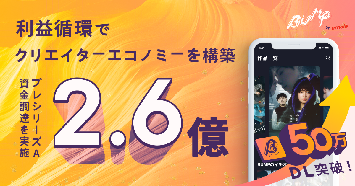 1話3分のショートドラマアプリ「BUMP」を手掛けるemole株式会社(本社:東京都目黒区、代表取締役:澤村直道、以下、emole)は、計6社のベンチャーキャピタル[千葉道場ファンド、サムライインキュベート、D4V(Design for Ventures)、朝日メディアラボベンチャーズ、ココナラスキルパートナーズ、アドウェイズ・ベンチャーズ 以下、VC]を引受先とする2.6億円の第三者割当増資(プレシリーズAラウンド)を実施しました。シードラウンドの調達額とあわせて、これまでに累計3.1億円を調達しています。今回の資金調達によりアプリユーザーの拡大と、クリエイターが参画しやすいプラットフォームへの進化を加速させ、emoleがビジョンとして掲げる「創造で挑戦できる世界へ」を早期に実現します。