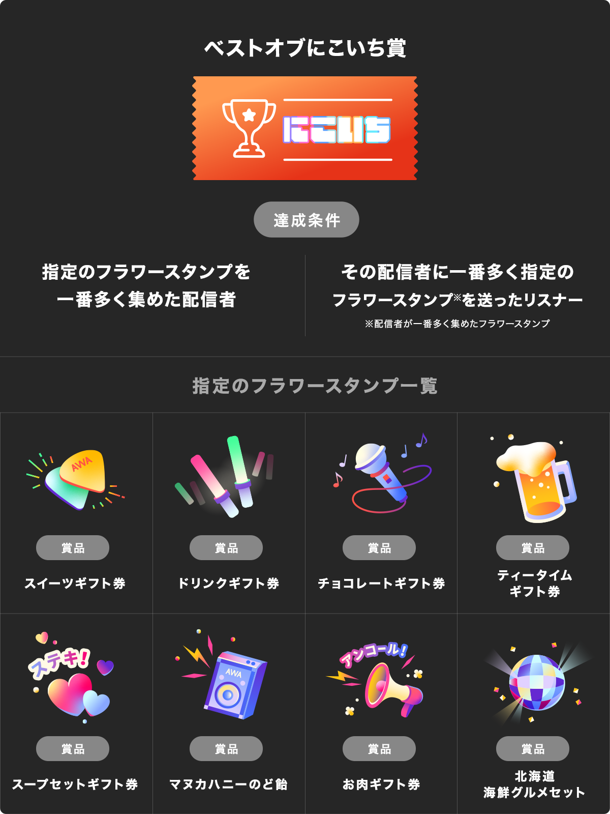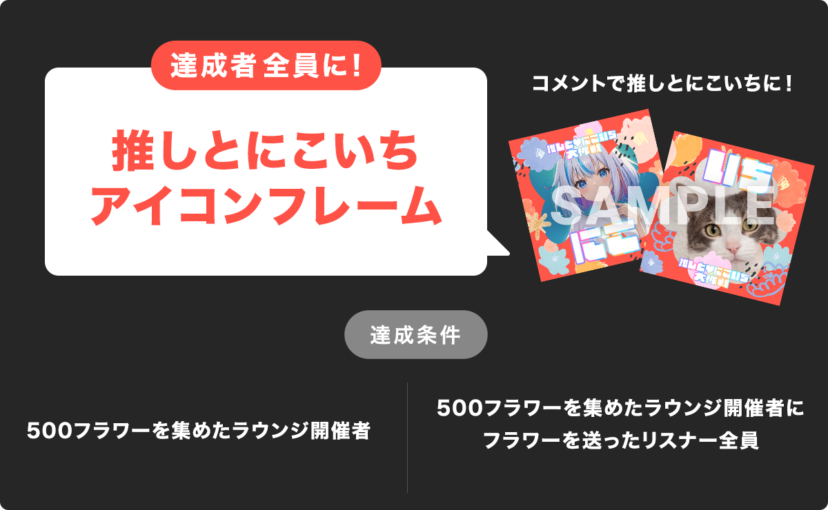 概要:指定の各フラワースタンプを一番集めたラウンジ開催者と、そのラウンジ開催者に指定のフラワースタンプを1番送ったリスナーへベストオブにこいち賞として「推しとお揃い賞品」をプレゼントいたします。さらに、1番じゃなくても条件達成で「推しとにこいちアイコンフレーム」をプレゼント。