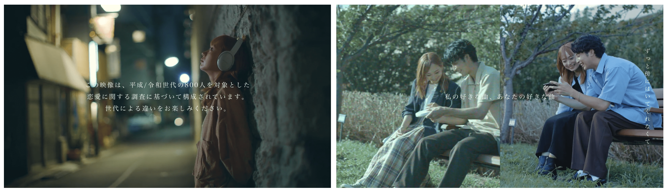 本ショートムービーは、実際に平成世代(34~36歳)と令和世代(19~21歳)それぞれ400名へ恋愛観の実態調査を実施のうえ制作を開始。調査結果を元に左右2分割で構成されており、世代の異なる恋愛シーンが同時進行いたします。