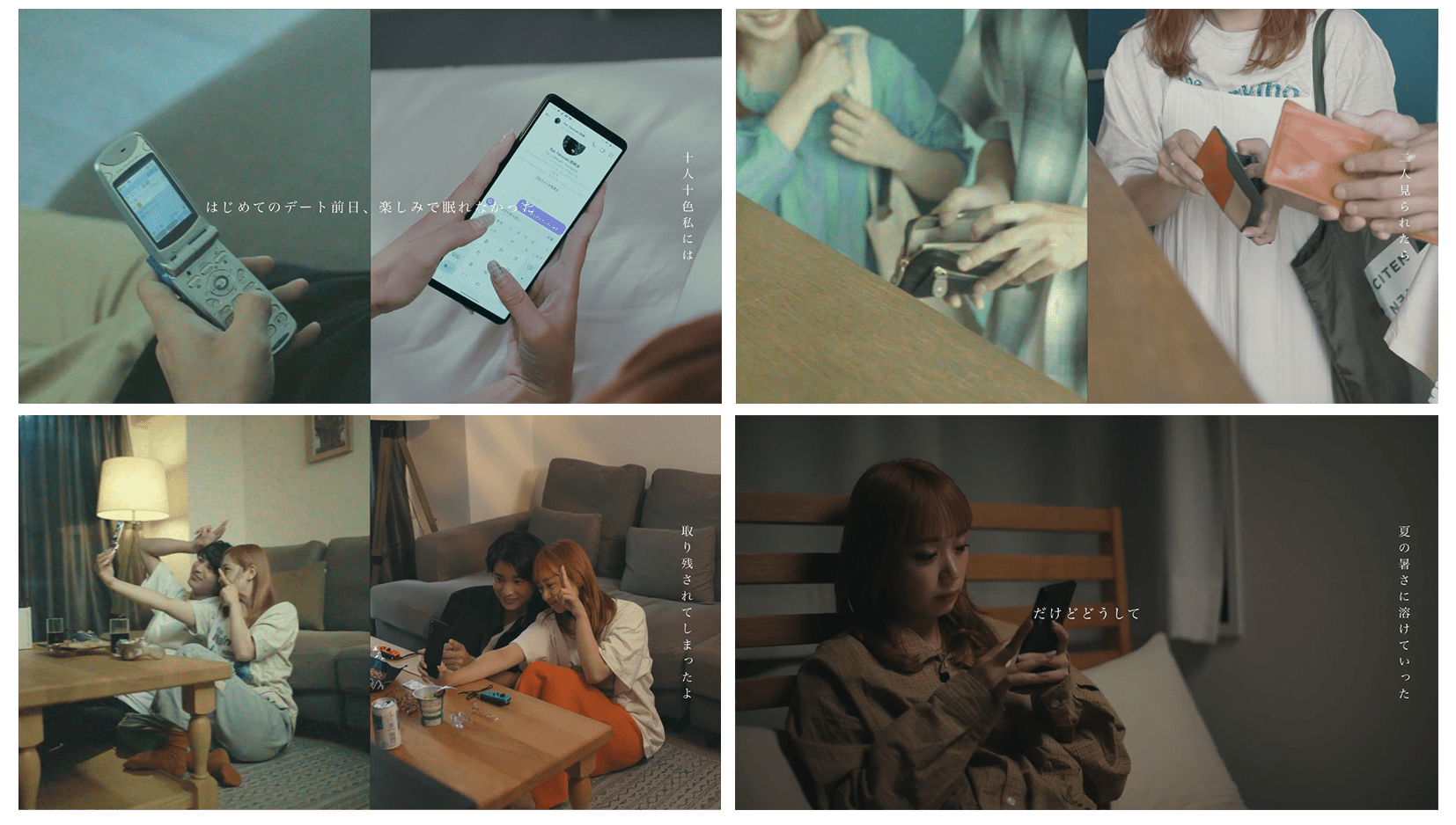 本ショートムービーでは、平成と令和のカルチャーが交差するシーンを主に左右(左が平成、右が令和)に描き分けています。