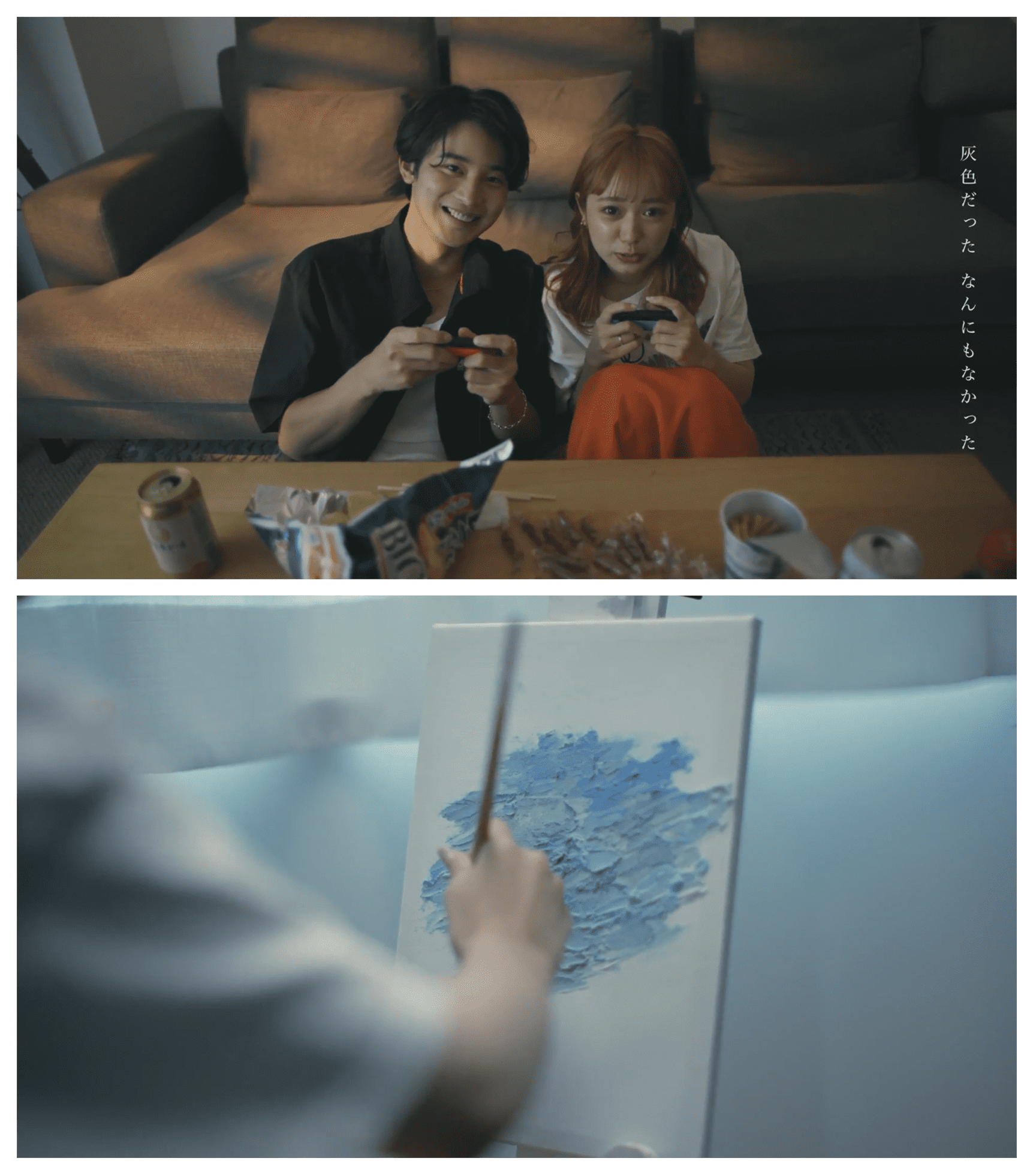 お互いに相手が運命の人だと思い付き合うことで、空白だった心が鮮やかになったり、付き合って月日が経ち、価値観のずれが大きくなり別れてしまうシーンを、今回のコンセプトである世代感の差と、同時に登場する真っ白なキャンバスの変化で表現しました。