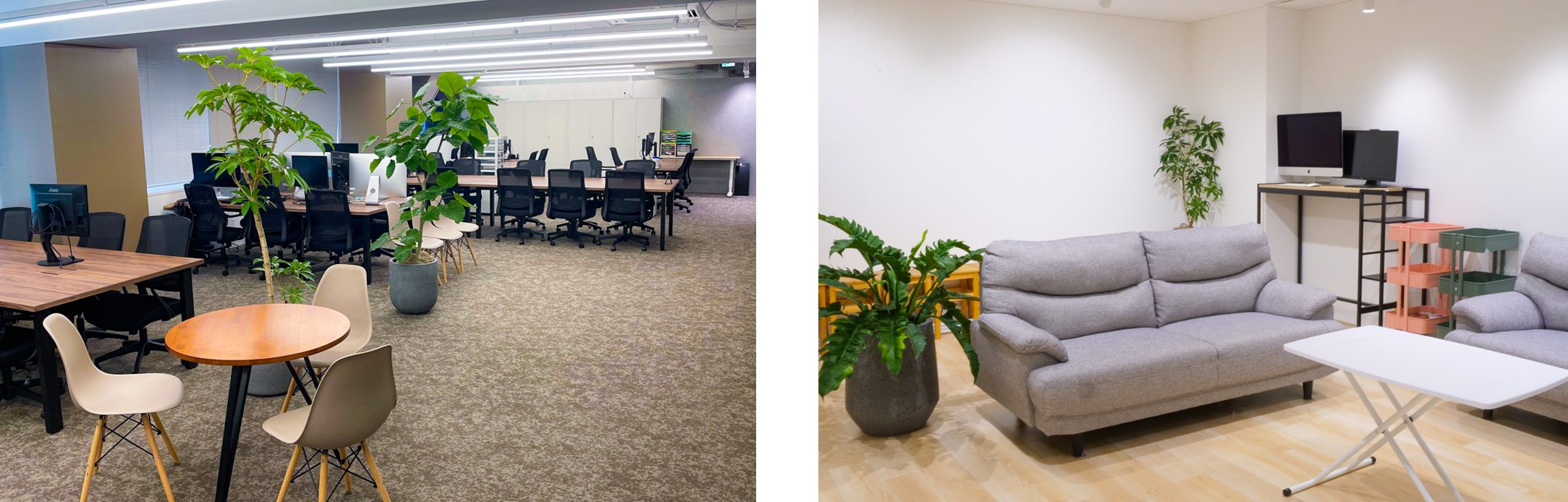 新本社は明るく暖かみのある内装で、2つのスタジオは、撮影や編集作業の有無に関わらず、クリエイターが集い、リラックスして自由に過ごせるように空間設計しました。また、執務エリアには植物や丸テーブルを設置し、社員同士や社員とクリエイターが、気軽にコミュニケーションをとれるような環境づくりを目指しました。