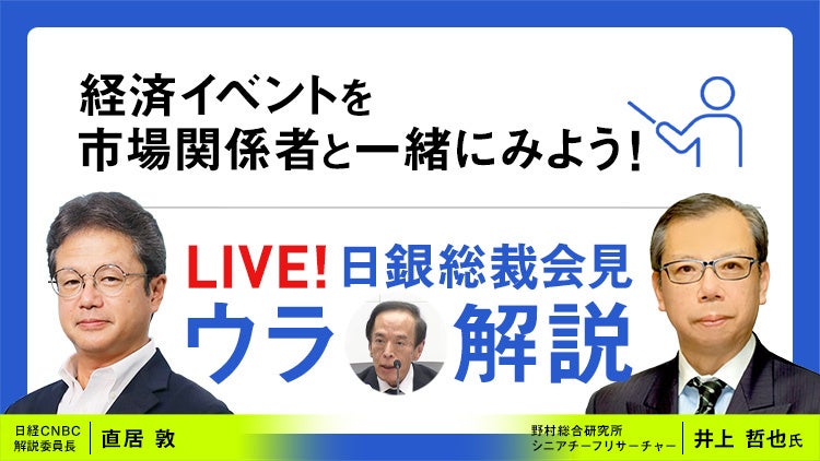 日本銀行は9月21~22日に植田和男総裁のもとで金融政策決定会合を開きます。番組では、22日の決定会合開催後に行われる植田総裁の会見を見ながら、井上哲也氏(野村総合研究所 シニアチーフリサーチャー)と日経CNBC解説委員長の直居敦が、植田総裁の発言をはじめ、記者が総裁に投げかける質問の意図などをZoom上のチャットでライブ解説します。日経CNBC online会員だけが視聴できる限定コンテンツです。