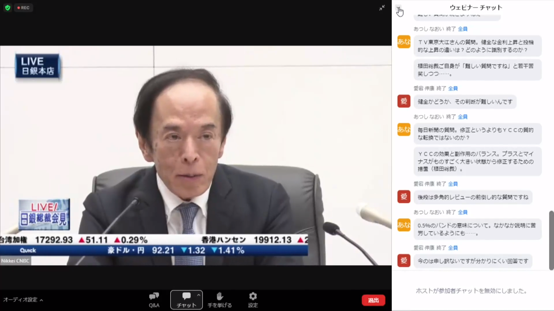 開催当日の15:20からプレトークを行い、総裁会見が始まる15:30から会見終了まで、Zoomのチャット機能を使ってリアルタイムで解説します。同時に配信する植田総裁の映像を視聴しながら、専門家の解説を文字情報で確認することができます。※画像は前回(7/28配信)の様子です。