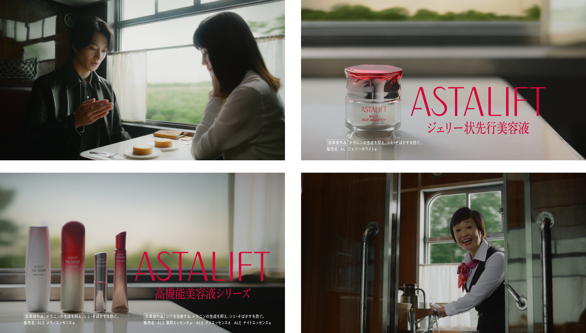 新TVCM「列車のふたり 赤の力」篇と「列車のふたり リポソーム」篇には、俳優の宮﨑あおいさんと岡田将生さんが出演。「列車のふたり リポソーム」篇には、ふたりに加え、新たに客室乗務員役として、増田明美さんが登場します。列車で偶然出会った宮﨑さんと岡田さんの会話を通じて、土台ケア(※2)から、エイジングケア(※1)まで叶えるジェリー状先行美容液「アスタリフト ホワイト ジェリー アクアリスタ」や、大人の深い肌悩みにフォーカスし、その一つひとつに対し最適なケアを極めた(※3)高機能美容液シリーズ「アスタリフト ザ セラム」の特長を伝えます。「アスタリフト」の特徴成分であり独自のナノ分散技術で微細化した「ナノアスタキサンチン(※4)」と、化粧品以外のヘルスケア分野で培ったリポソーム技術を化粧品向けに応用して開発した当社独自の浸透型リポソーム(※5)を、赤いスポンジボールやロールケーキを使って説明するシーンにご注目ください。