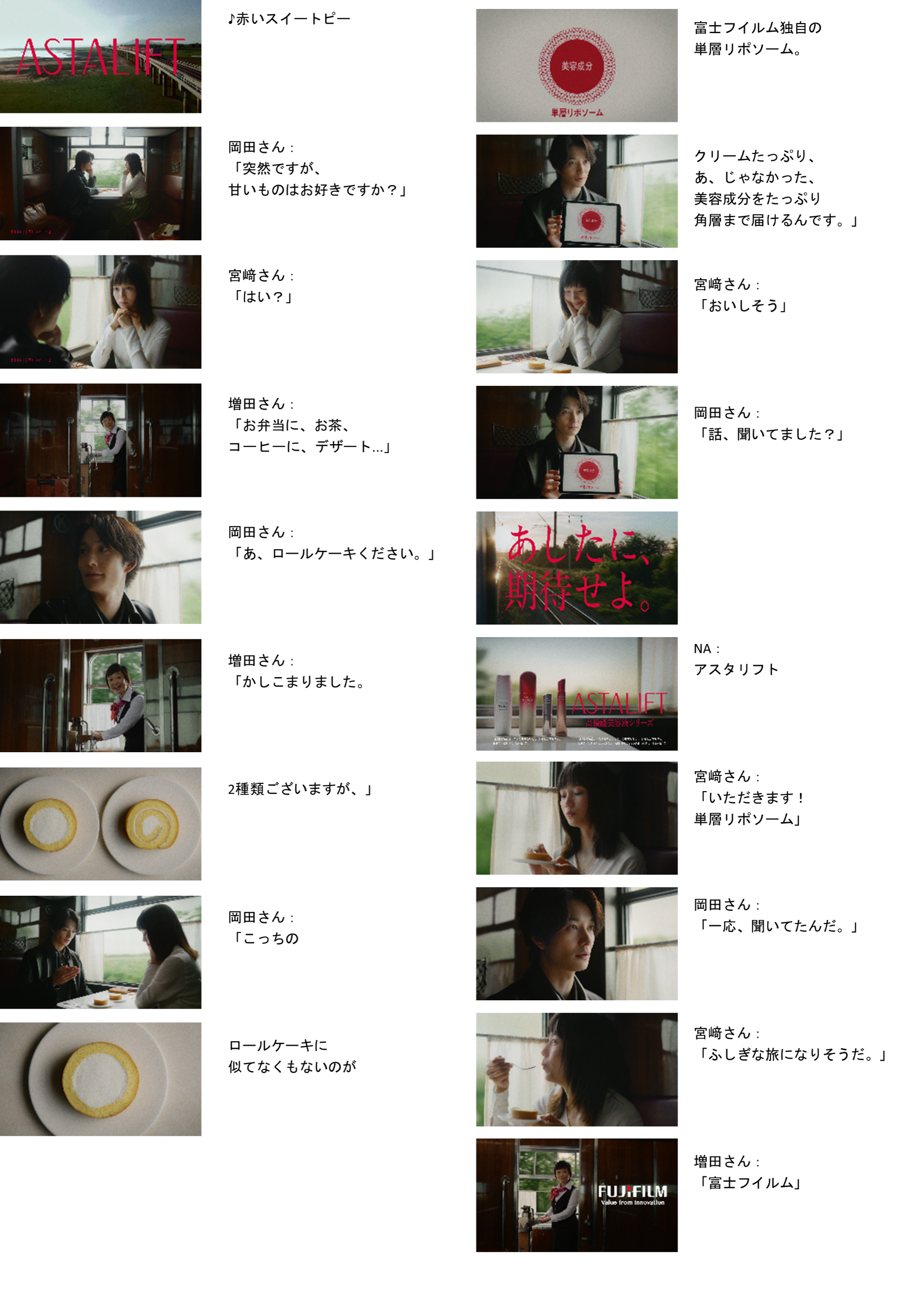 列車の客室で向かい合う男女。男が車内販売で「ロールケーキ」を注文する。続けて男は説明する。「クリームたっぷりのロールケーキ」に似ているというのが、富士フイルム独自の浸透型リポソーム(※5)。一層の膜で形成する「単層」構造で内部に多くの美容成分を含有する機能をもち、必要な成分を肌に届ける(※6)。「ロールケーキ」が気になる女。コンパートメントの入り口には、何故かまだ居る客室乗務員。期待に満ちたあしたに向かって、ふしぎな列車の旅は、まだ、続く・・・。