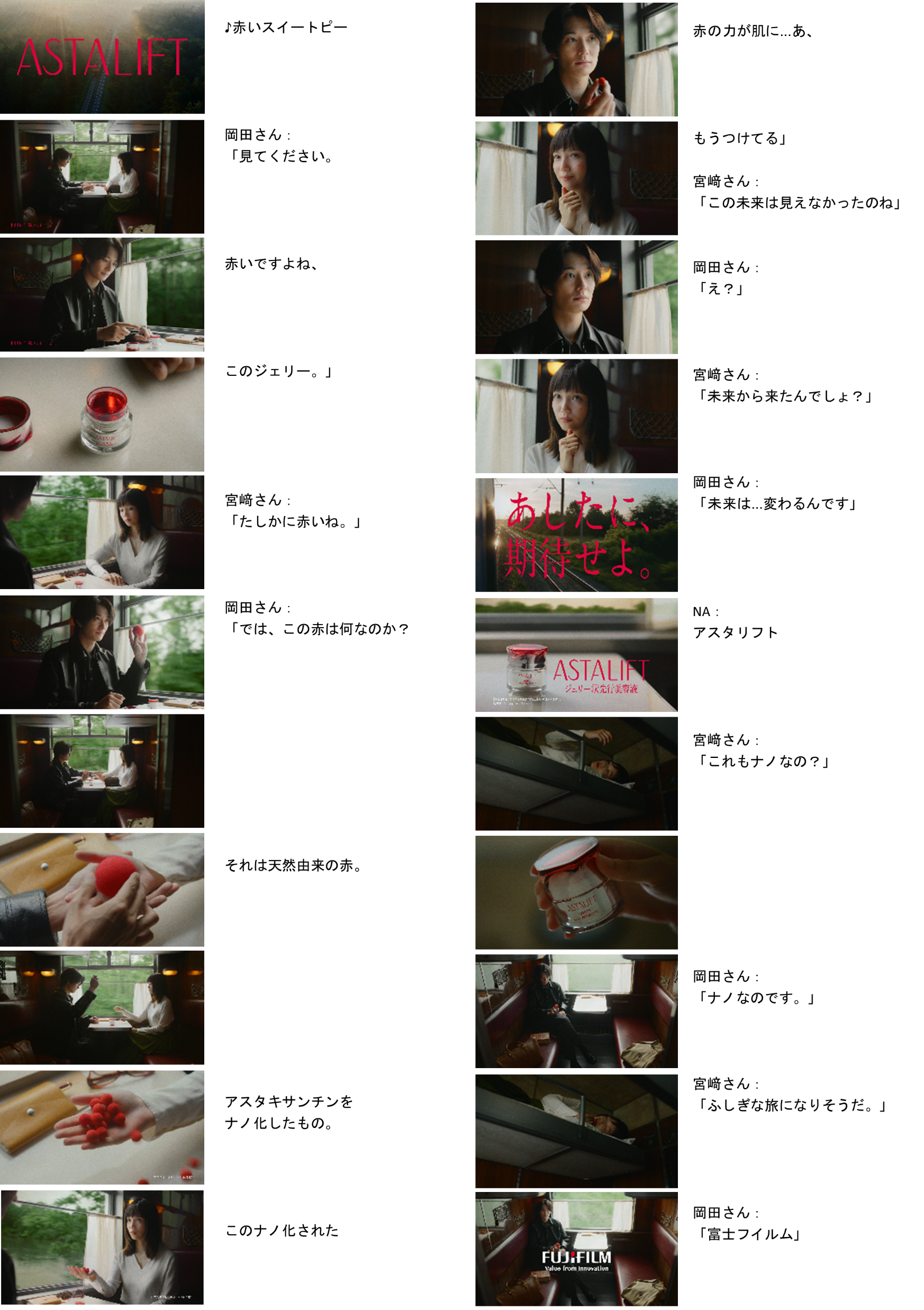 今回放映を開始する2篇のTVCMは、宮﨑あおいさん演じる“何かから逃れるように列車に乗り込む女性”と、岡田将生さん演じる“未来から来た男性”の、ふしぎな列車の旅の様子を描く「あしたに、期待せよ。」シリーズの続篇です。写真フィルムの開発で培った技術を活用し“実感できる”スキンケアを目指す「アスタリフト」の魅力を、宮﨑さんと岡田さんのふたりの会話と「あしたに、期待せよ。」というキャッチコピーでお伝えします。楽曲には、前篇に引き続き松田聖子さんの名曲「赤いスイートピー」を使用しています。「列車のふたり リポソーム」篇には、ふたりが乗車する列車の客室乗務員役として増田明美さんが新たに登場します。