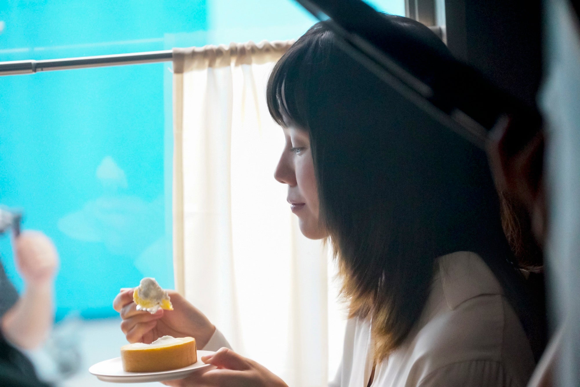 富士フイルム独自の浸透型リポソームの「単層」構造をロールケーキに例えて岡田さんが解説する場面では、宮﨑さんが楽しみにしていた本物のロールケーキが登場。事前の打ち合わせで監督から「ロールケーキは食べられますか?」と尋ねられ、満面の笑顔で「はい!」と答えていた宮﨑さんは、窓際のテーブルに置かれたしっとりフワフワなロールケーキを見てニッコリ。フォークでそっと口に運んだ宮﨑さんは、笑みを浮かべながらゆっくり味わっていました。