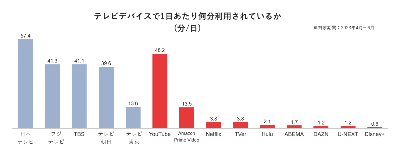 CTV利用世帯において、YouTubeの視聴時間が日本テレビに続いて第2位となりました。Amazon Prime Videoの視聴時間もテレビ東京に迫る勢いとなりました。全体を通してみると、日本テレビの視聴時間が最も長く、依然として、地上波キー局の存在感が大きいと言えます。