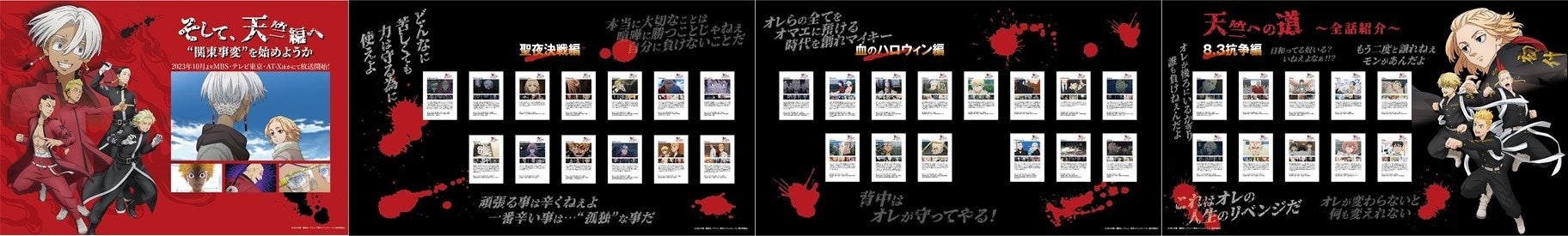 2021年から放送開始した”8・3抗争編”から“血のハロウィン編”“聖夜決戦編”までの全話の各ストーリーを追った展示を行います。“天竺編”にむけて、これから『東京リベンジャーズ』を観る方にストーリーを知っていただけるだけでなく、ファンの方には、新シリーズをより楽しむための振り返りとして、お楽しみいただけるコーナーになっています。