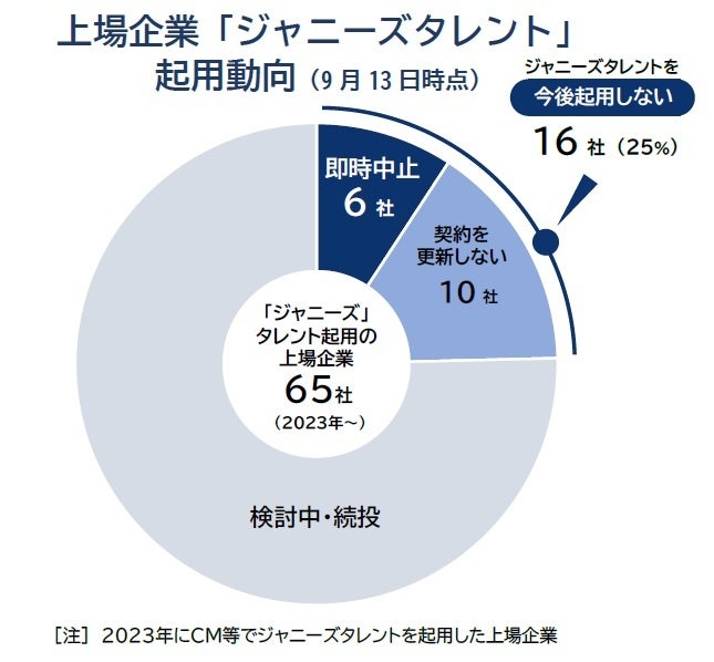 広告や販促活動でジャニーズタレント起用の「見直し」が上場企業で広がっている。自社のテレビCMなど広告や販促物にジャニーズタレントを起用した上場企業は、2023年以降で65社判明した。このうち、9月13日時点で放映中のCMなどを「即時中止する」対応を示したのが6社、契約期間満了後に「契約を更新しない」が10社で、25%にあたる16社が「起用しない」方針を表明した。当初は続投方針を示したものの、一転して起用を見送るケースもみられた。起用見直しの理由はいずれも「人権侵害・ハラスメントを一切容認しない」ことが挙げられた。