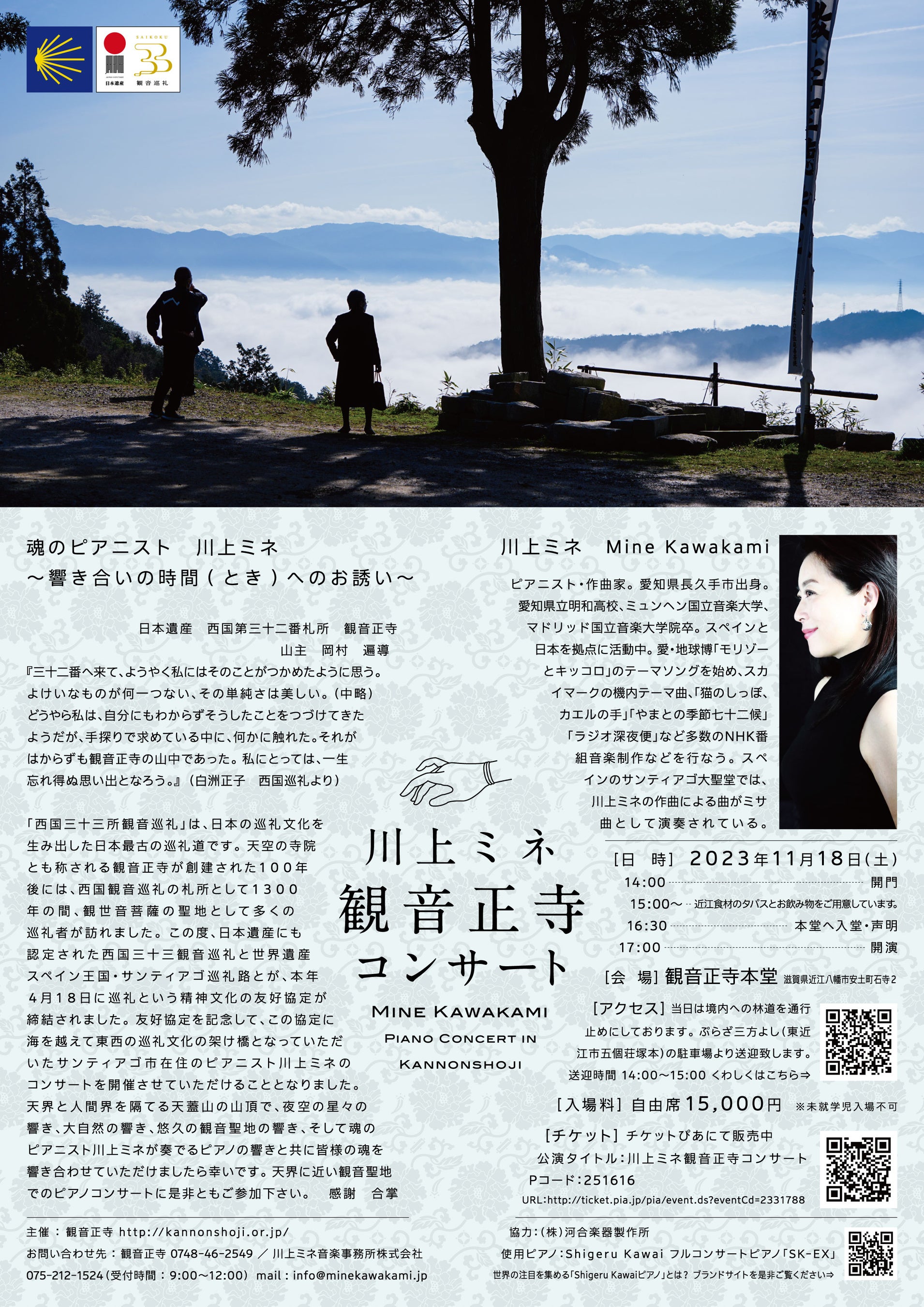 「西国三十三所観音巡礼」は、日本の巡礼文化を生み出した日本最古の巡礼道です。天空の寺院とも称される観音正寺が創建された100年後には、西国観音巡礼の札所として1300年の間、観世音菩薩の聖地として多くの巡礼者が訪れました。この度、日本遺産にも認定された西国三十三観音巡礼と世界遺産スペイン王国・サンティアゴ巡礼路とが、本年4月18日に巡礼という精神文化の友好協定が締結されました。友好協定を記念して、この協定に海を越えて東西の巡礼文化の架け橋となっていただいたサンティアゴ市在住のピアニスト川上ミネのコンサートを開催させていただけることとなりました。