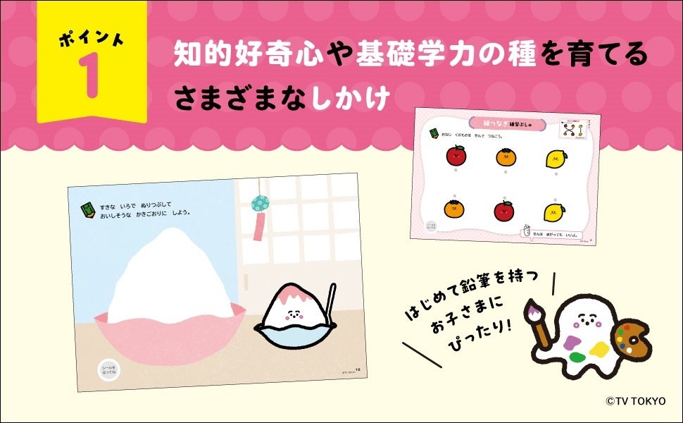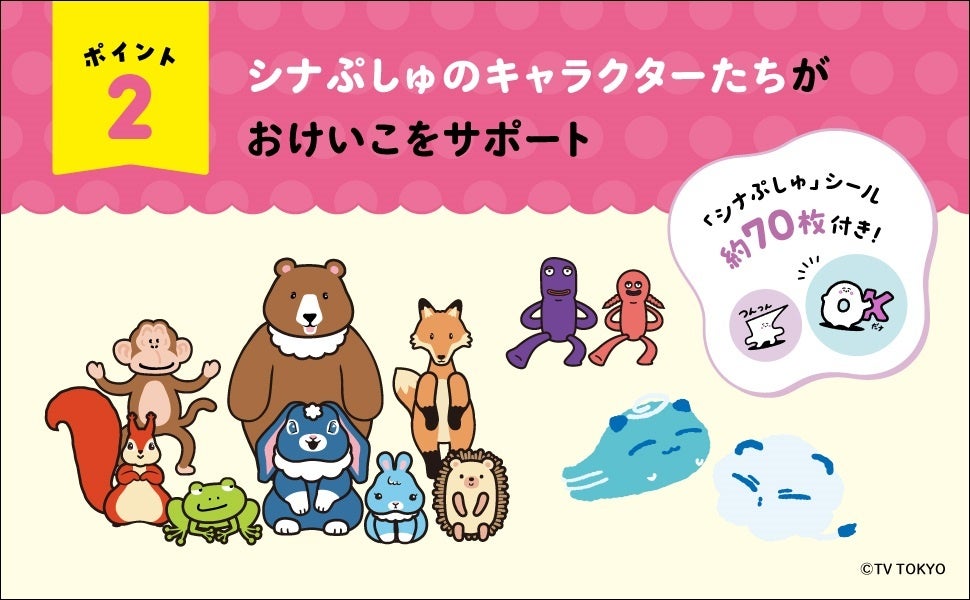 人生最初のおけいこだからこそ、お子さまも親御さまも肩ひじ張らずに、無理なく楽しく学習できるように構成されています。「シナぷしゅ」に登場するキャラクターたちに優しく導かれながら、「知的好奇心」や小学校入学までに備えておきたい「基礎学力の種」を育てることができます。