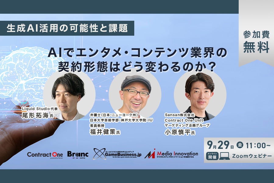 株式会社イード(本社:東京都中野区、代表取締役:宮川 洋)が運営するビジネスメディア(Branc/GameBusiness.jp/Media Innovation)とSansan株式会社(本社:東京都渋谷区、代表取締役CEO:寺田親弘、以下 Sansan)は、オンラインセミナー「生成AI活用の可能性と課題~AIでエンタメ・コンテンツ業界の契約形態はどう変わるのか?~」を9月29日(金)に開催いたします。