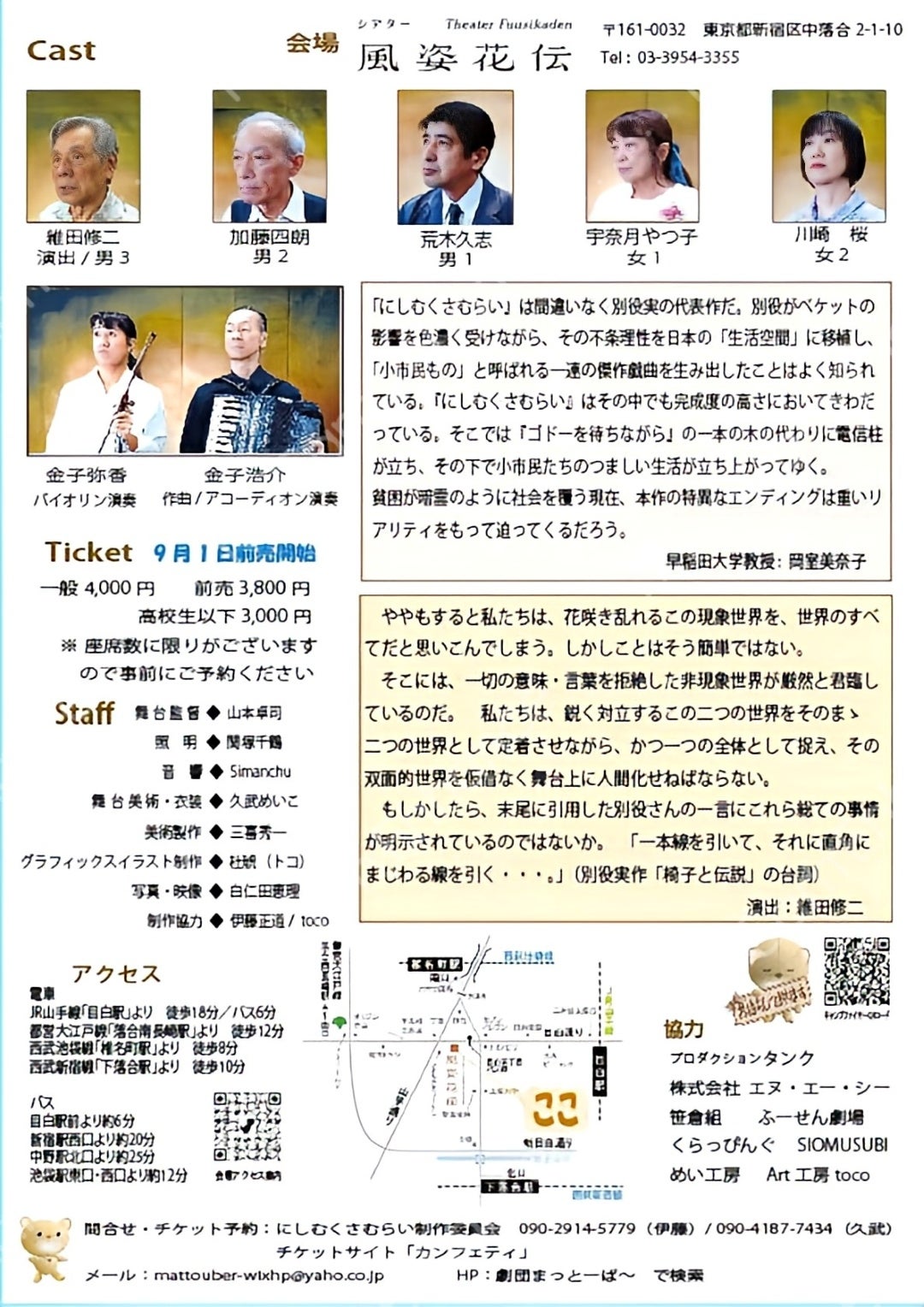 別役実作・維田修二演出「にしむくさむらい」(副題 夜風と交響する五人のホームレス)をシアター風姿花伝で上演します。オリジナル楽曲によるバイオリン生演奏でのお届けです。