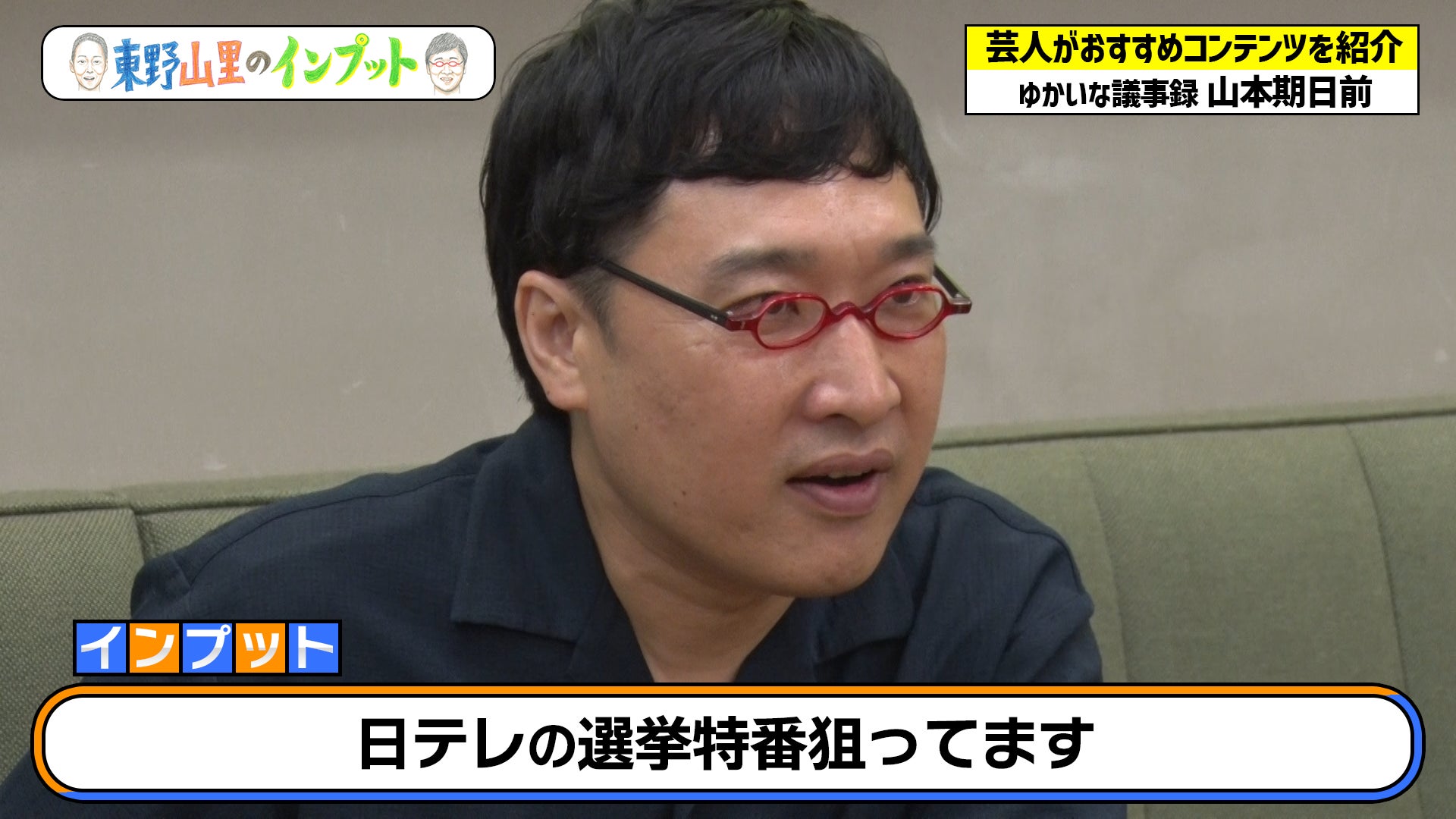 今回のプレゼンターは、“選挙大好き芸人”山本期日前(ゆかいな議事録)。テーマは「選挙」です。東野は、次に選挙があったと仮定して「俺の勘では、日本テレビの選挙特番、(山里を指差しつつ)三番手くらいに、さも平然と立っていると思うのよ」と予想。東野の言葉に火がついたのか、山里も「期日前くん……マジだよ?」と訴えます。