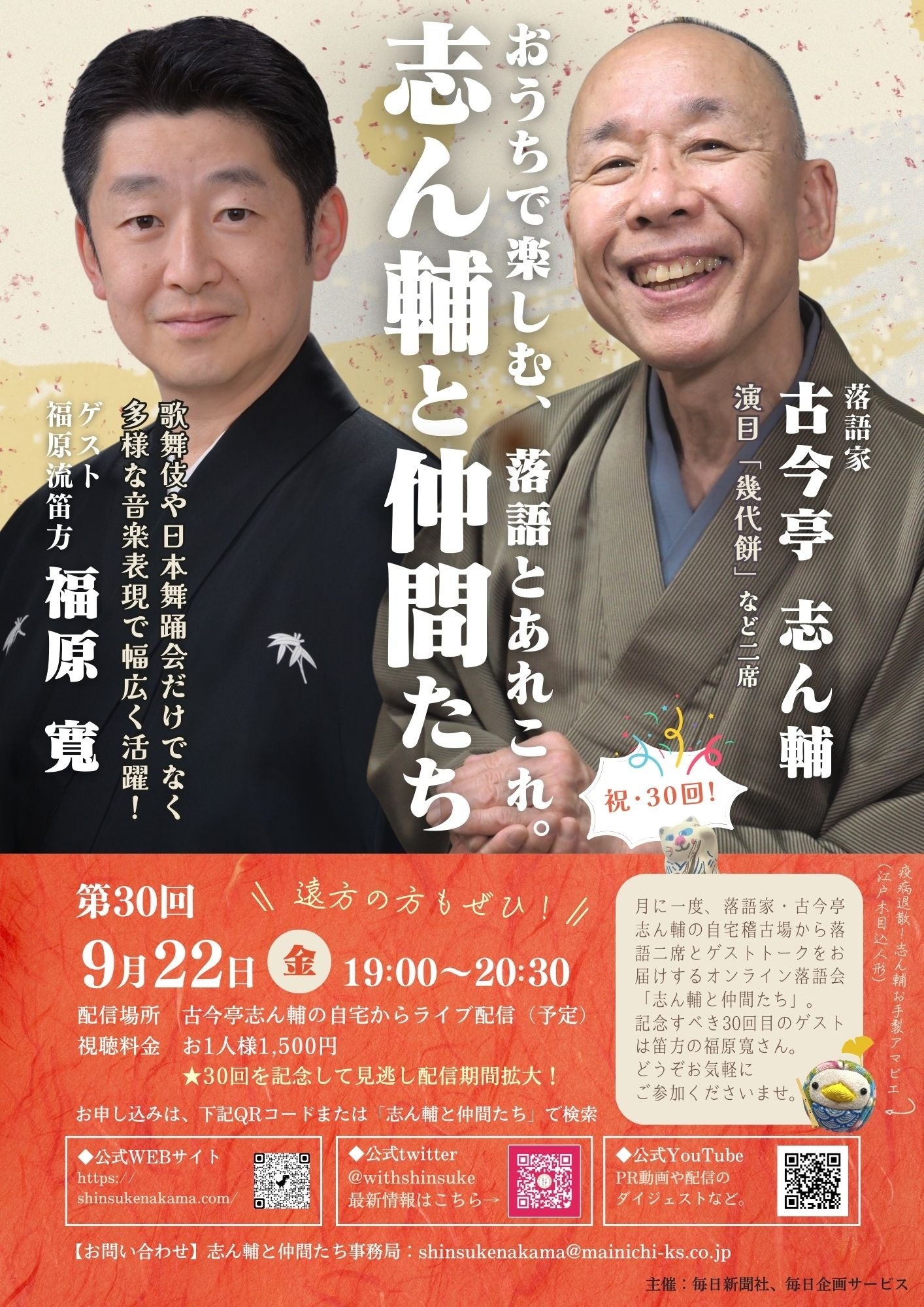 毎日新聞社は9月22日(金)午後7時から、オンライン落語会「志ん輔と仲間たち」をインターネットでライブ配信します。演目は「幾代餅」など2席。福原流笛方の福原寛さんがゲスト出演します。