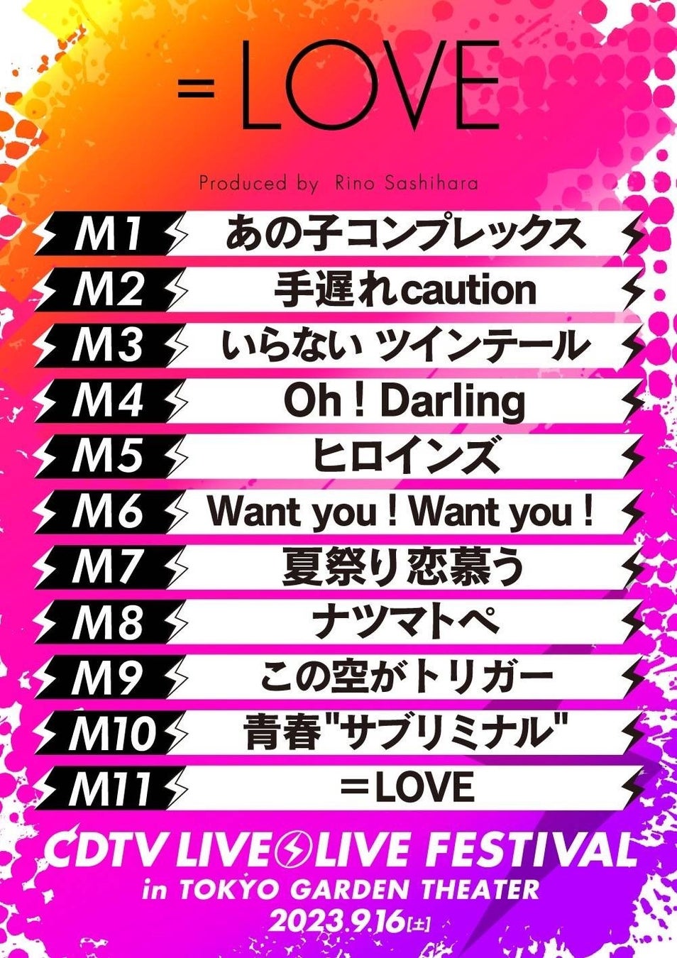 TBSで毎週月曜日の夜に生放送している『CDTVライブ!ライブ!』。一昨年、昨年に引き続き、3回目となる「番組」×「アーティスト」×「観客」が一体となるスペシャルライブステージ「CDTVライブ!ライブ!フェスティバル2023」が本日、東京ガーデンシアターにて開催され(イベントは、9/16~9/18 3days開催)、=LOVEが初出演を果たした。