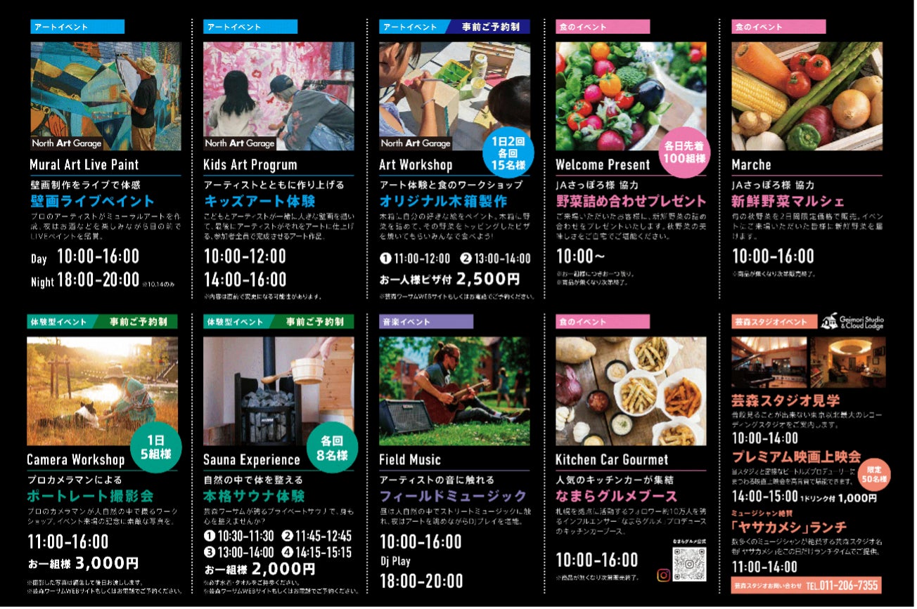 北海道札幌市の芸術の森エリアにある総合アウトドア施設「芸森ワーサム」の大自然のなかで、アートと、食と、音楽に触れる体感型イベントです。北海道ではなかなか見ることのできない巨大壁面へのミューラル(壁画)アートの制作をライブで鑑賞、子どもから大人まで参加できるアートイベントから、食育をテーマとして、地元野菜を自分で選びそれをその場で調理し食べるという体験やそれらを彩る道内アーティストによるストリートミュージックが奏でられる特別な空間となります。他にもキッチンカーや縁日や本格サウナ体験やプロカメラマンによる大自然の中での撮影ワークショップなどコンテンツ盛りだくさんとなっています。
