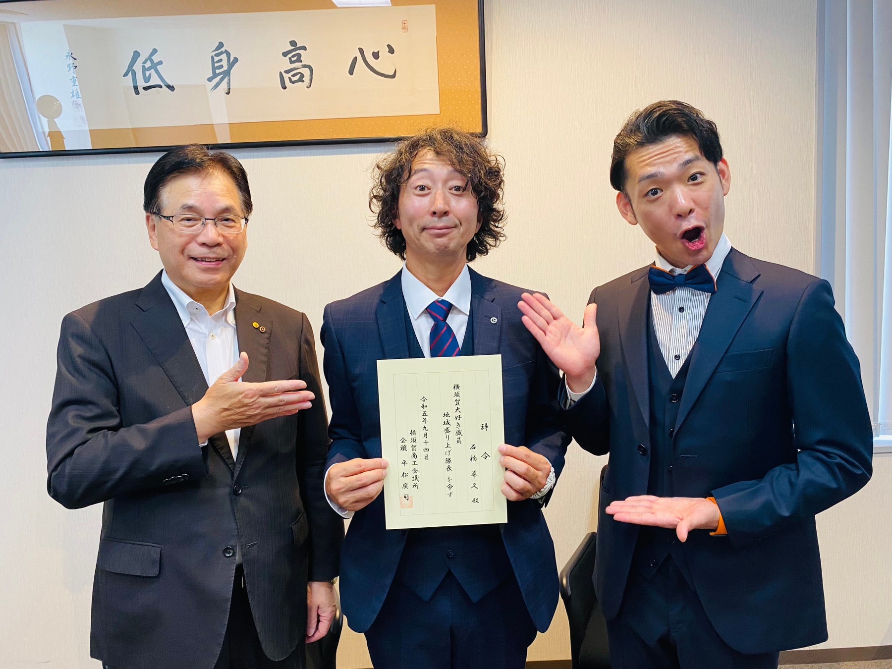 無事に辞令交付式が執り行われ、名刺も受け取った石橋は、「芸人の“お笑い力”を使って面白楽しい横須賀にするべく頑張っていきますので、みなさま応援のほどよろしくお願いいたします!」と意気込みを語り、それに対し平松会頭からは、「まずはみなさんに知っていただくために、現場に出て、漫才をしたりしながら芸人さんらしくアピールしてもらいたい。そして、新しい横須賀の魅力を発見してもらって、それを横須賀経済の発展につなげていければ」とさっそく期待を寄せました。