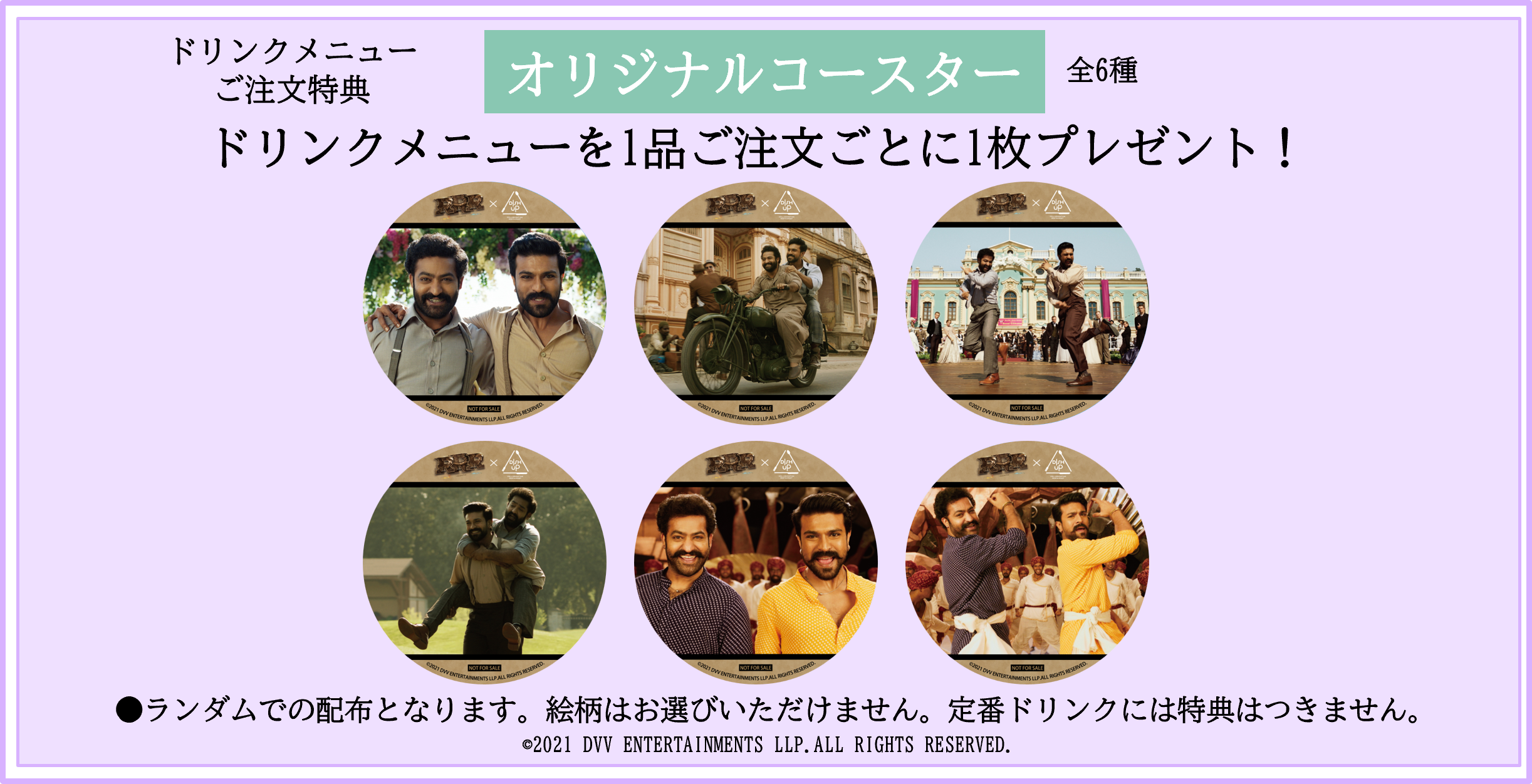 ドリンクを注文された方にオリジナルコースター(全6種)をランダムで1枚プレゼントいたします。