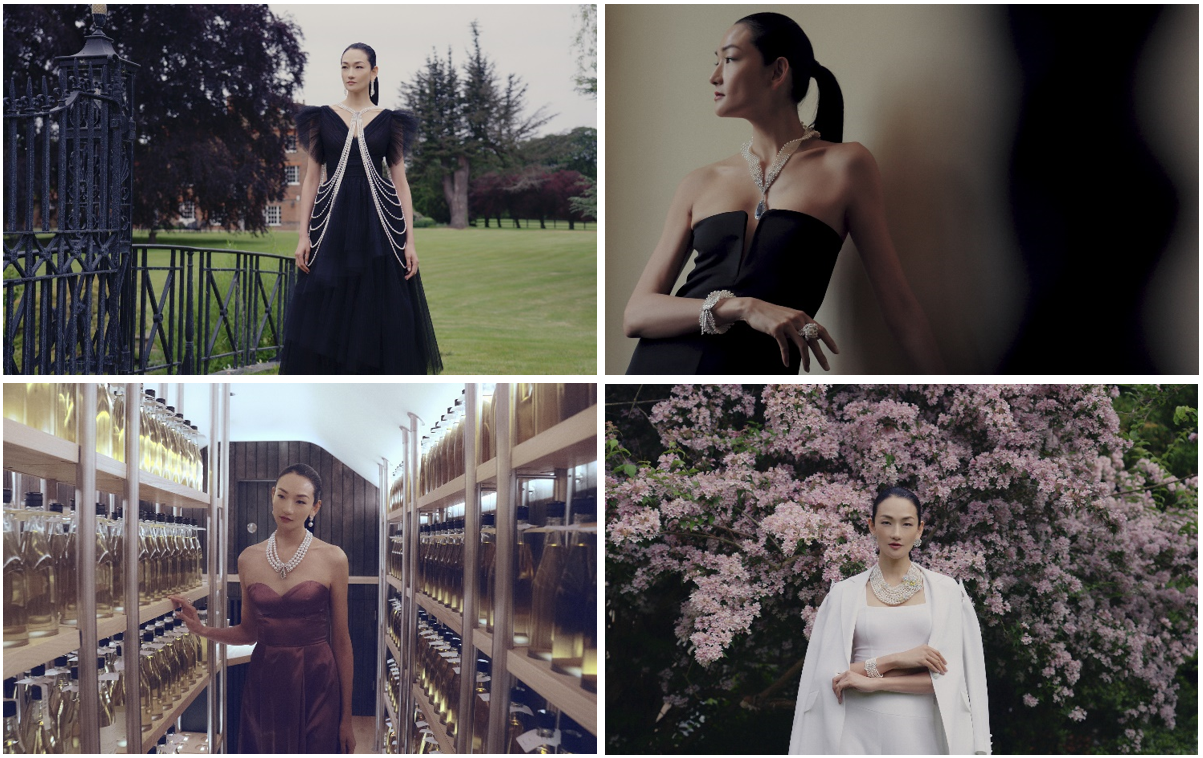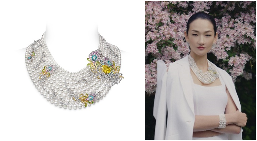 動画では冨永さんが、ミキモトのハイジュエリー4点を纏い登場。洗練されたドレススタイルをさらに華やかにするアイテムです。