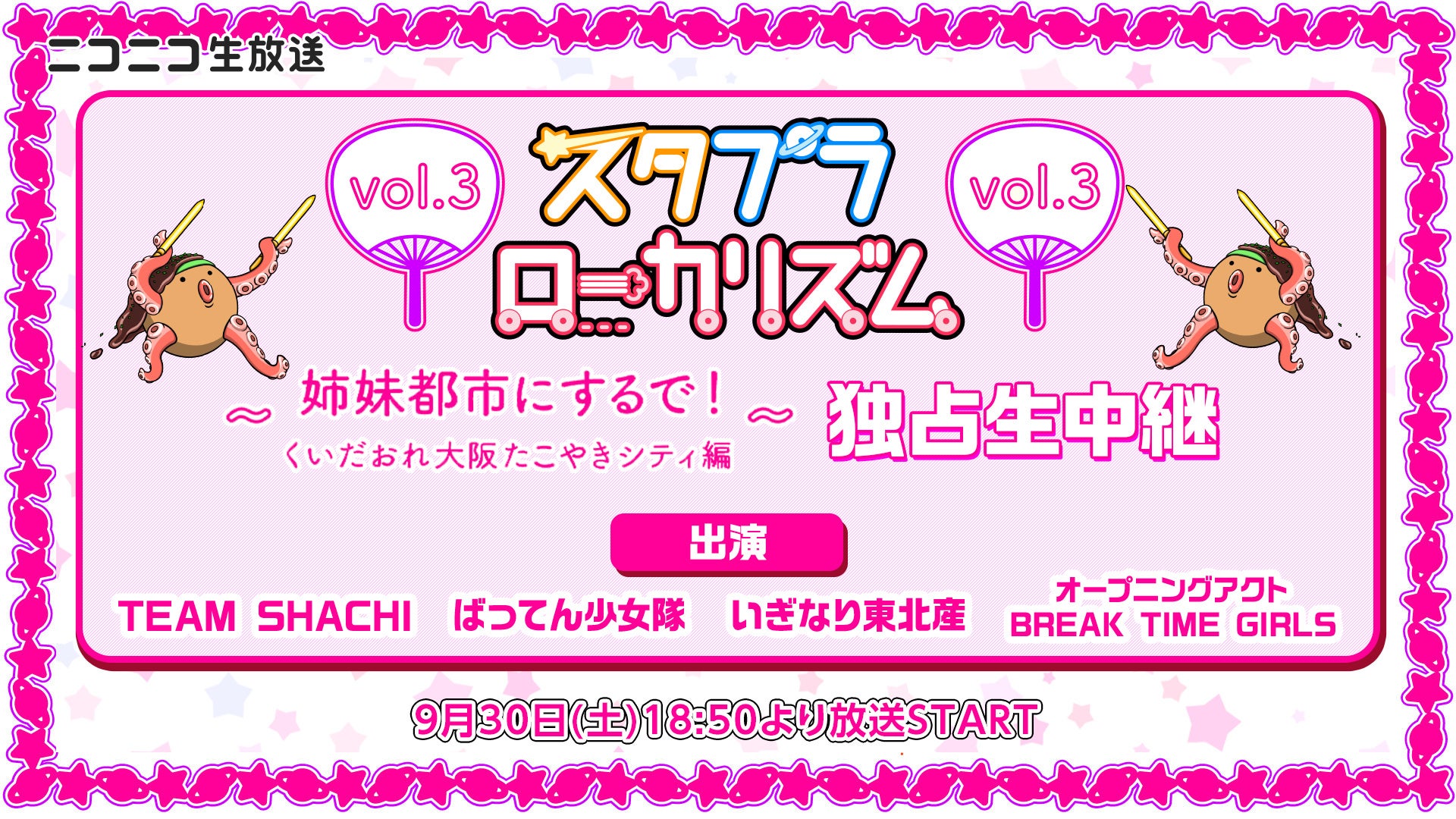 2023年9月30日(土)に大阪・GORILLA HALL OSAKAにて開催される、スターダストプラネットの「地方組」として知られるTEAM SHACHI、ばってん少女隊、いぎなり東北産の3組が集結するイベント「スタプラローカリズム vol.3 ~姉妹都市にするで!くいだおれ大阪たこやきシティ編~」の第2部を、全編ニコ生で独占生中継!
