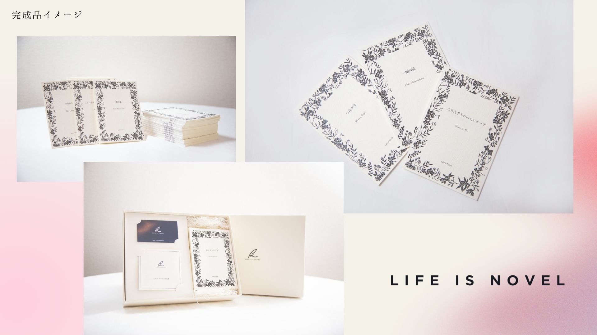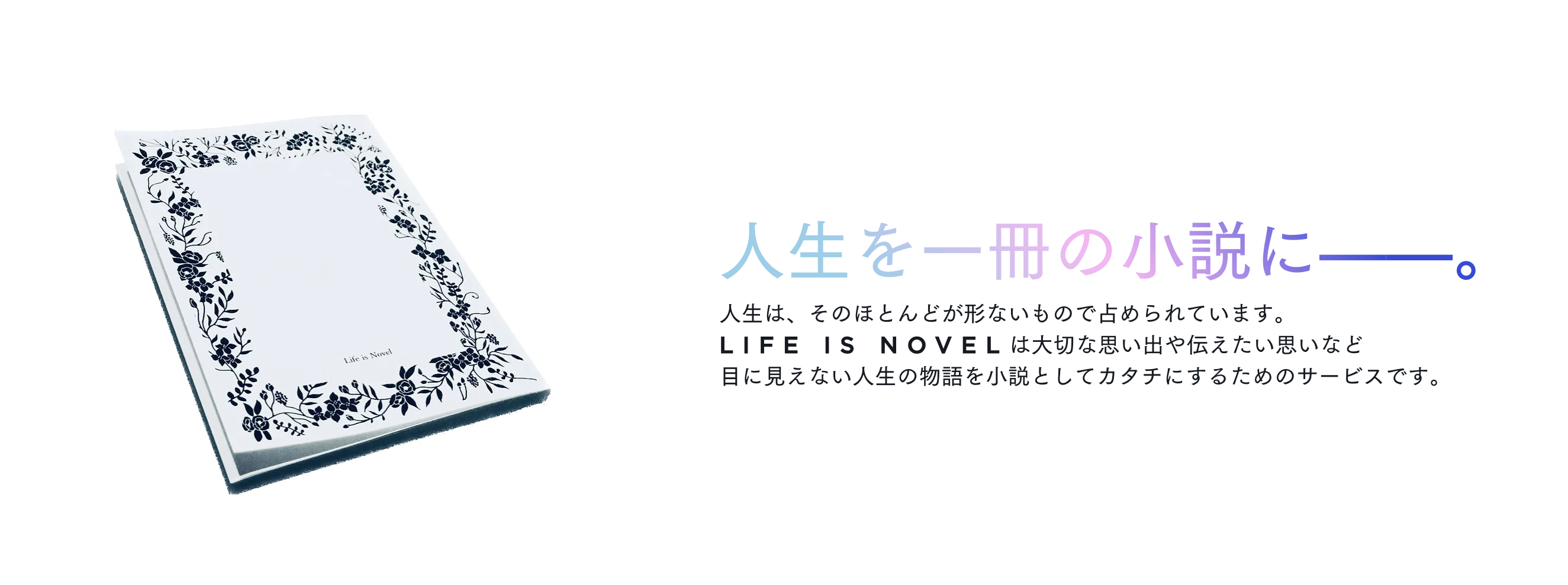 Life is Novelは、顧客の人生を文学賞の選考通過実績をもつ作家陣が小説として綴り、文庫本に製本後、お届けするサービスです。想いや思い出をカタチにして残すため、またはギフトとして、結婚式・金婚式・転職・終活といったシーンで利用されてきました。