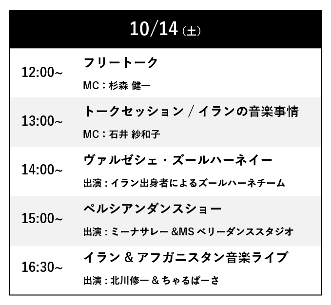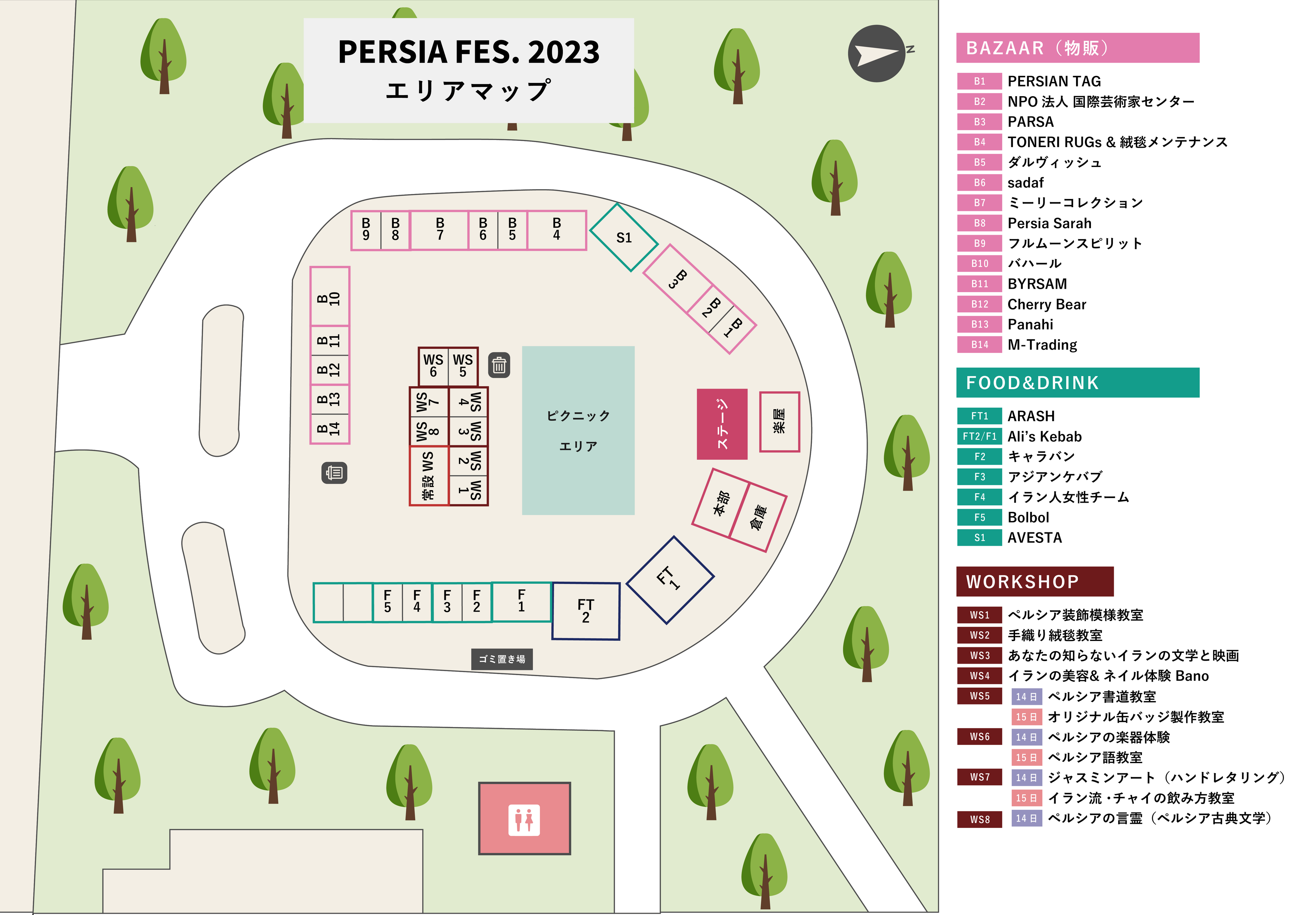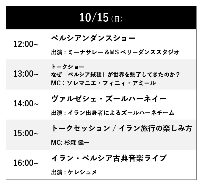ペルシャ文化を五感で体験できるイベントとして、本場のペルシア料理を集めたフードゾーン、イラン・ペルシアの古典音楽やペルシャンダンス等のステージを設置。また、ペルシア雑貨やサフランをはじめとしたペルシア料理には欠かせない食材などの販売や、各種ワークショップなど様々な形のコンテンツをお届けいたします。