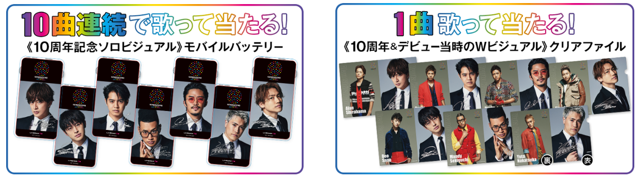 賞品*5      :【10曲連続で歌って応募】サイン入り10周年記念ソロビジュアルモバイルバッテリー7名様