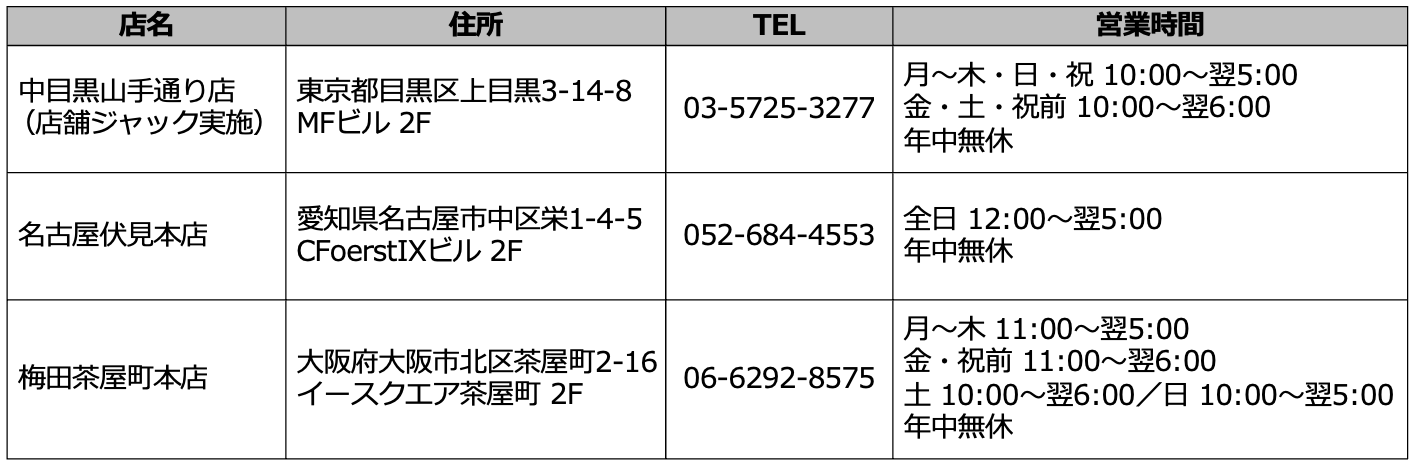 プライム中目黒店/横浜相鉄口駅前2号店/名古屋伏見本店/梅田茶屋町本店/三宮生田ロード本店/