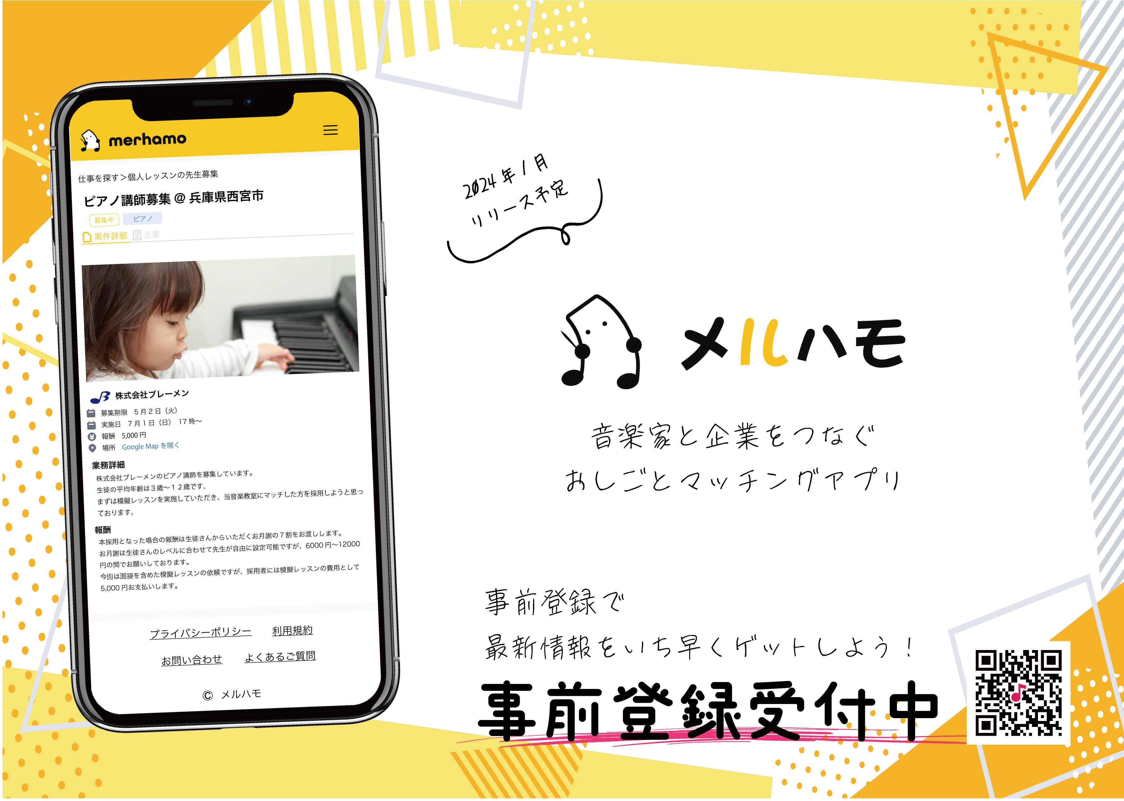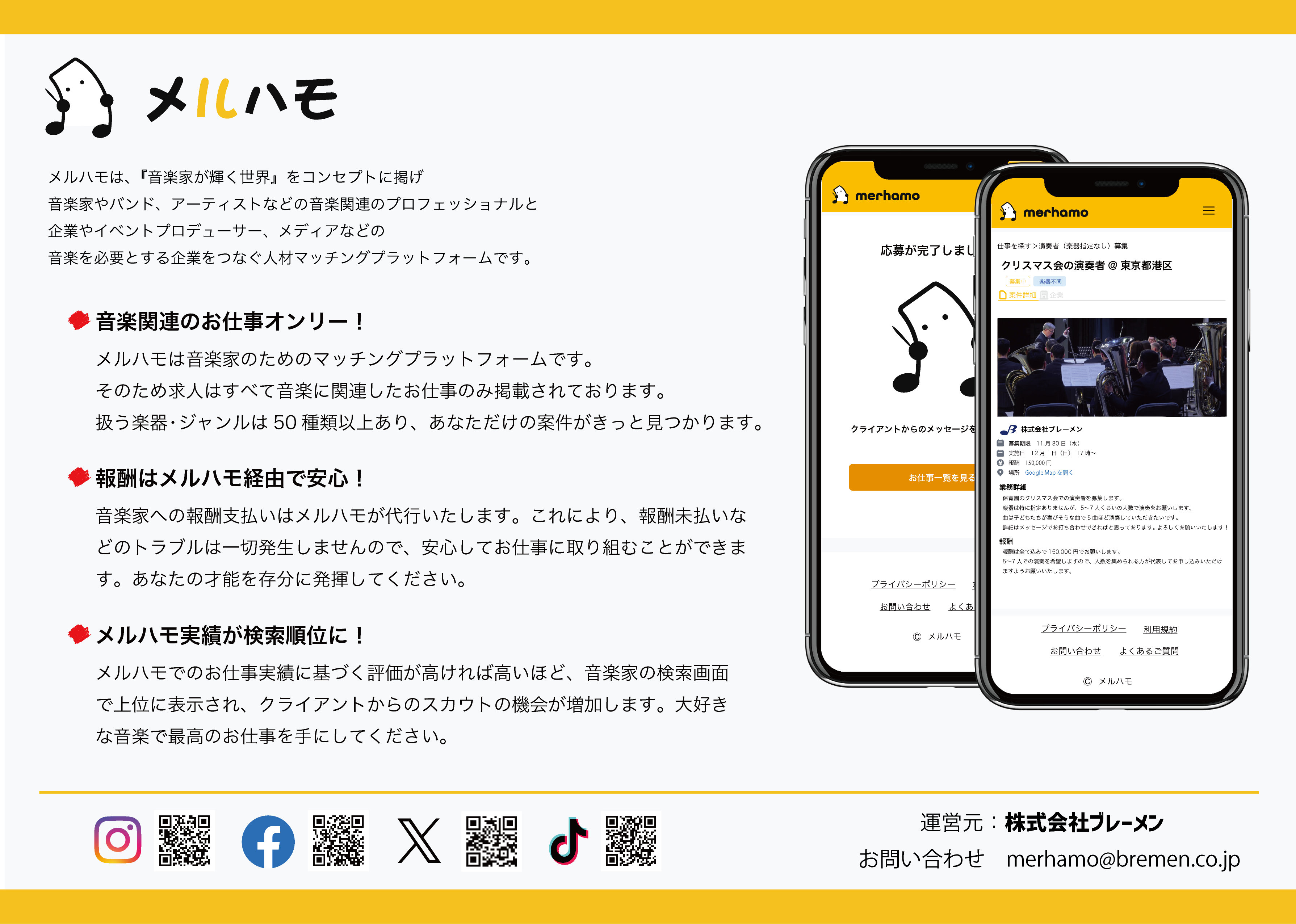 メルハモは、『音楽家が輝く世界』を基本理念に掲げ、音楽家やクリエーターなどの音楽関連のプロフェッショナルと、音楽を必要とする企業や組織、メディアなどをつなぐ人材マッチングプラットフォームです。