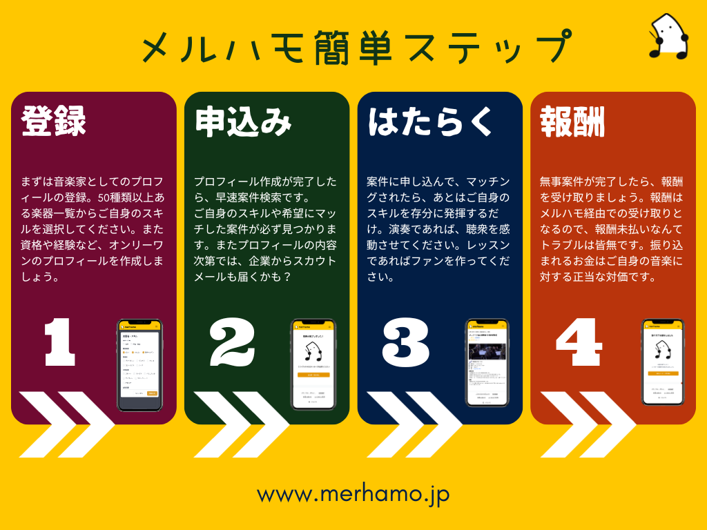 報酬はメルハモ経由で安心! 音楽家への報酬支払いはメルハモが代行いたします。これにより、報酬未払いなどのトラブルは一切発生しませんので、安心してお仕事に取り組むことができます。あなたの才能を存分に発揮してください。