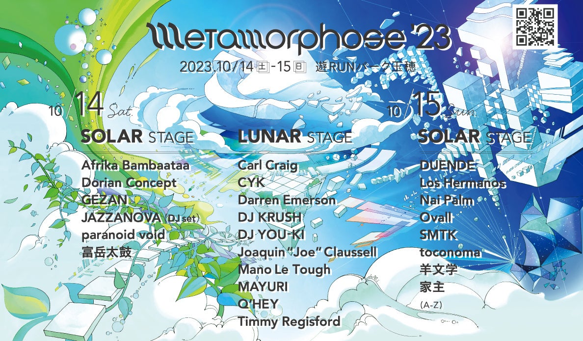 2023年10月14.15日開催の伝説的野外オールナイトフェス「Metamorphose」[SOLAR SSTAGE]、[LUNAR STAGE] の2つのステージから構成され、総勢24組のアーティストが熱いパフォーマンスを繰り広げます。
