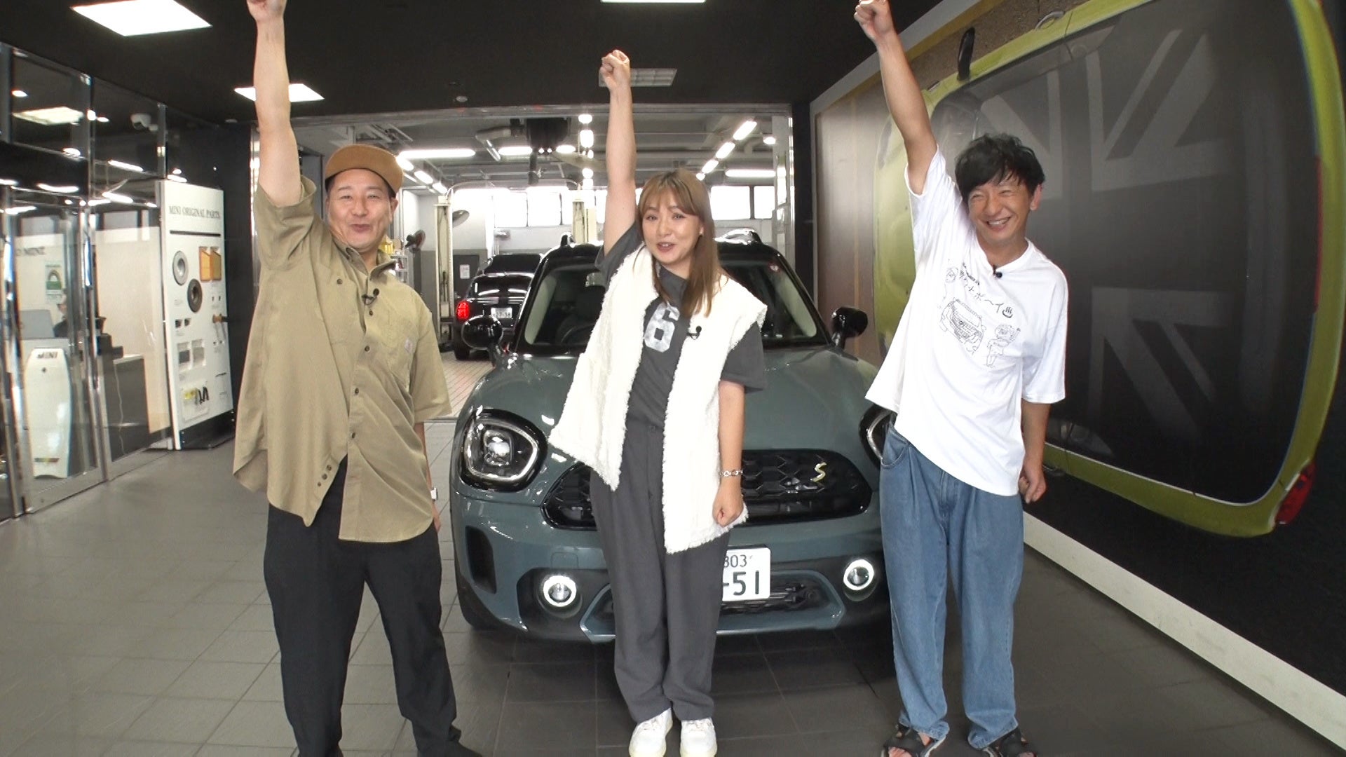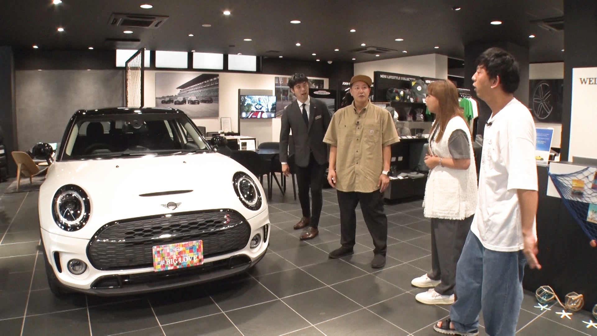 まずは「MINI 杉並店」で車見学。3人はディーラーがおすすめするモデルを見て回ります。トークをする中で、野呂が車を持っていないことが発覚。「車が欲しくて、調べていたら、(くるま温泉ちゃんねるが)ヒットした」と明かすと、向井が「BSよしもとで(車を)買っていただくことできますか?」とお願い。笑いを起こします。