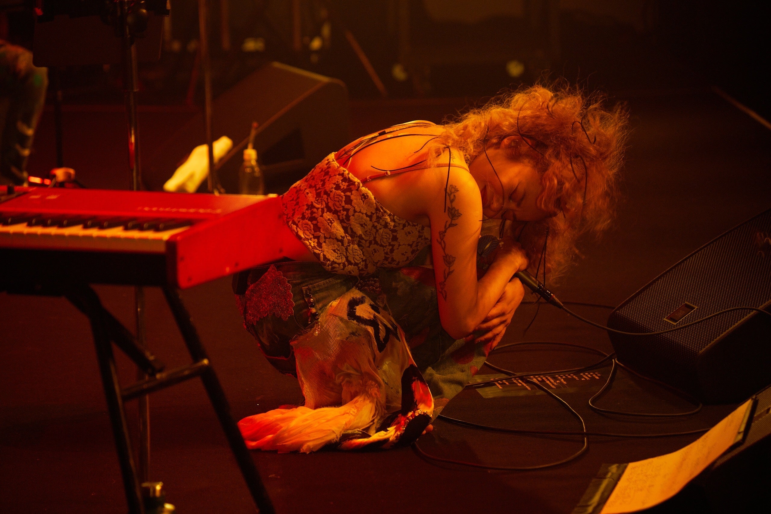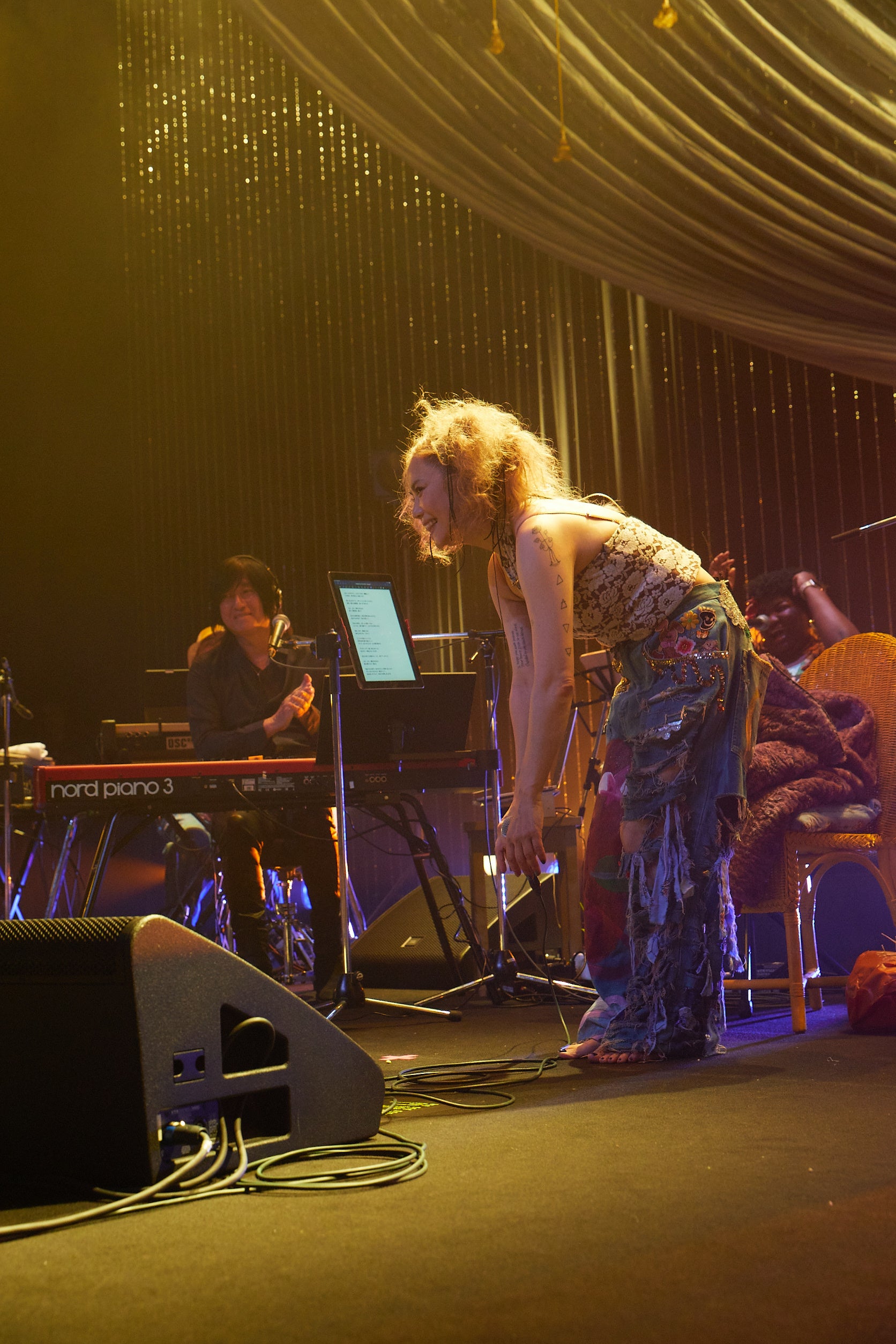 キーボードを弾きながら、時に甘く囁くように、時に激しく叫ぶように歌った「タイムマシーン」でも彼女のスペルのような響きを湛えた歌声と観客の大合唱が重なり、「ミルク」では、観客一人一人が口ずさみながらゆったりと体を揺らした。「やさしい気持ち」「しましまのバンビ」「タイムマシーン」「ミルク」は1997年にリリースされ、ミリオンセールスを記録した不朽の愛のアルバム『Junior Sweet』の収録曲。改めて、誰もが口ずさめる名曲が揃っていることを再確認していると、Charaは着替えのためにステージを下り、「hug」は竹本とオリヴィアがデュエットで歌唱。そして、1993年に岩井俊二監督のドラマ『FRIED DRAGON FISH』のエンディング曲として起用された「Break These Chain」でステージに戻ると、「今、歌った曲は浅野忠信さんが主演のドラマの主題歌で使われたやつだよ」と解説し、「すーちゃん(長女のSUMIRE)、今日、こっそり来てるはず」と明かした。