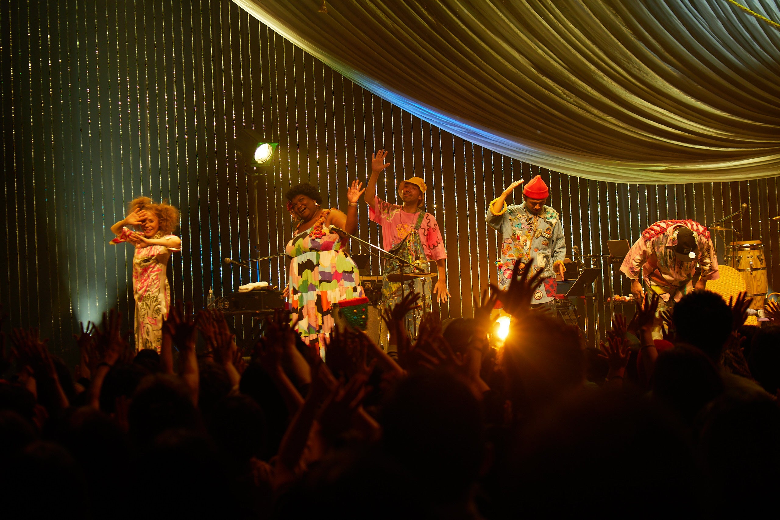 オープニングBGMとしてフランキー・ヴァリ「Can’t Take My Eyes Off You(邦題:君の瞳に恋してる)」が流れると、フロアから早くもクラップが沸き起こる中、オオニシユウスケ(BM、Gt)、皆川真人(Key)、竹本健一(Cho、Per)、オリヴィア(Cho)からなるバンドメンバーがカラフルな衣装に身を包んで登場。続いて、ピアノの調べに導かれるようにCharaが裸足で姿を現し、ステージ中央に置かれたラタンチェアに座り、Charaと竹本が共作した「面影」を静かに、語りかけるように歌い始めた。Chara、竹本、オリヴィアの3声で繰り返される<愛は永遠に>というフレーズによって、フロアには切なくも優しい、温かくリラックスしたムードが広がっていく。Charaがアコギを弾き、竹本がフロアタムとタンバリンで力強いビートを繰り出した「やさしい気持ち」では、Charaの「Charaを愛してよ!」という呼びかけによって盛大なクラップとコール&レスポンスが沸き起こり、2曲目にして早くも観客全員による大合唱となり、会場が一つとなった。