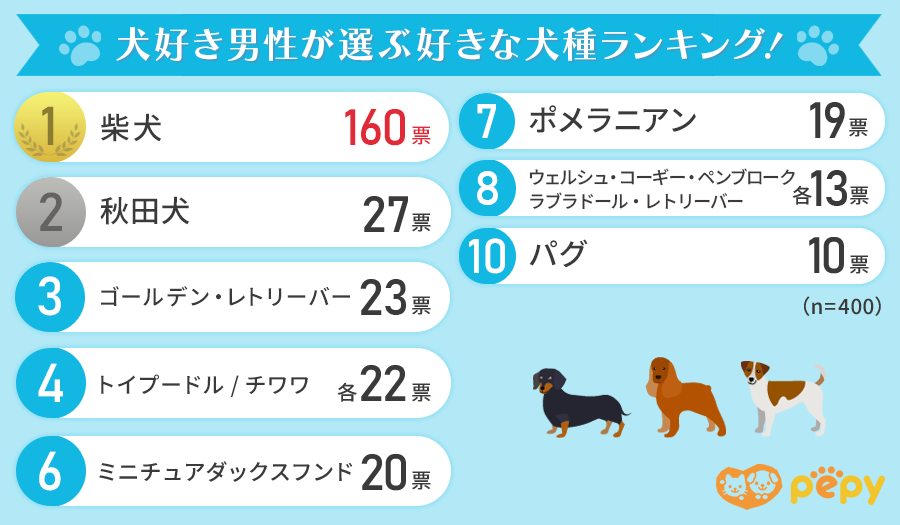 今回は事前調査で「犬が好き」と回答した全国の男性400人を対象に『好きな犬種』についてアンケートを実施。
