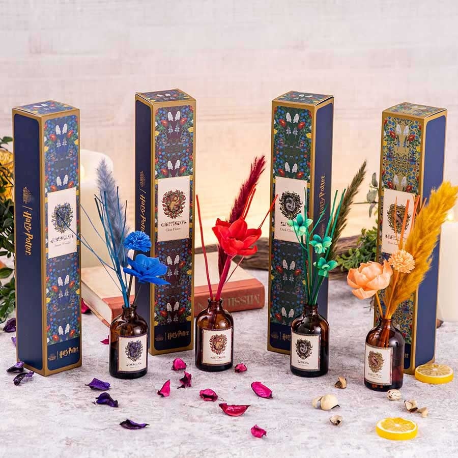 ホグワーツの各寮をイメージした香りを楽しめるリードディフューザーです。アンティークの薬瓶のような瓶には寮の象徴動物をデザインしています。各寮をイメージしたフラワーと羽ペンのようなテールリード、リードスティックがセットになっています。フラワーとリードスティックがオイルを吸い上げて、時間とともに各寮のイメージカラーに色づきます。お部屋をエレガントに彩り、お部屋のインテリアとして香りとともに「魔法ワールド」の世界をお楽しみいただけます。